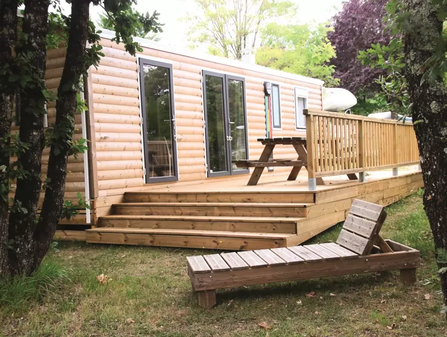 Mobil home de 27m² pour 6 personnes, composé d'une cuisine équipée, d'un coin repas, d'une chambre avec un lit double, d'une seconde chambre avec 2 lits simples et 2 lits superposés, d'une salle de bains avec douche, d'un WC séparé et d'une terrasse de 7m².