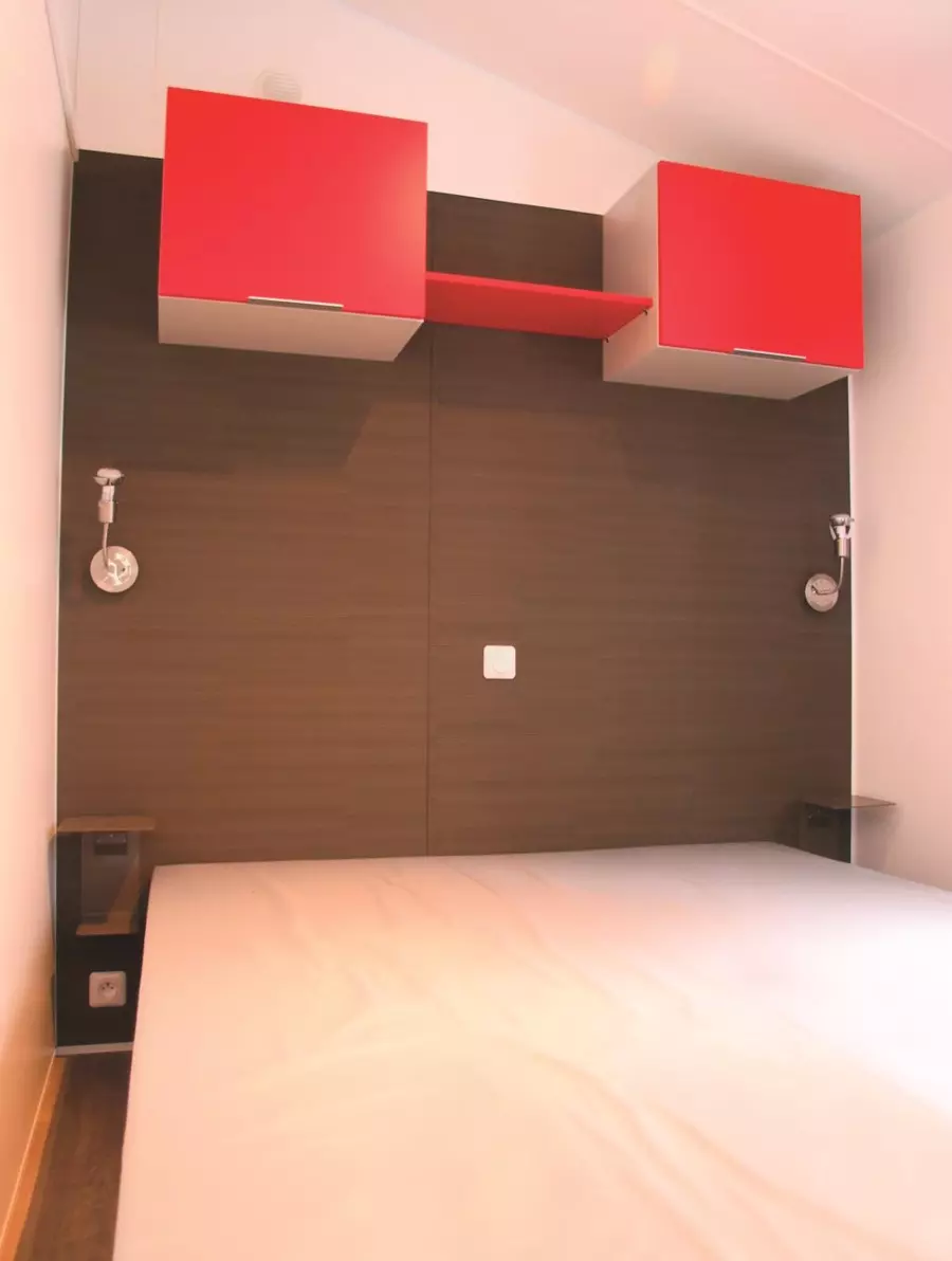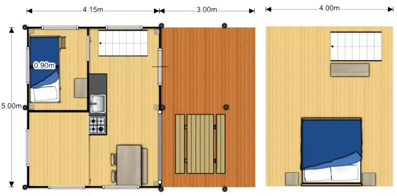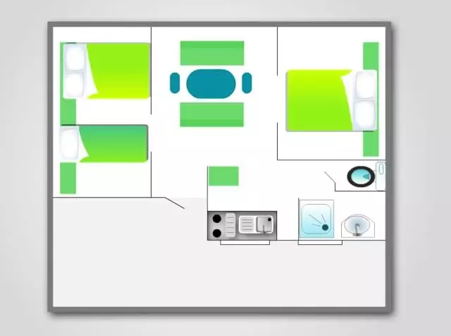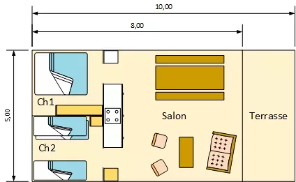 Mobil home de 23m² pour 4 personnes, composé d'une cuisine équipée, d'un coin repas, d'une chambre avec un lit double, d'une seconde chambre avec 2 lits simples, d'une salle de bains avec douche, d'un WC séparé et d'une terrasse de 8m².