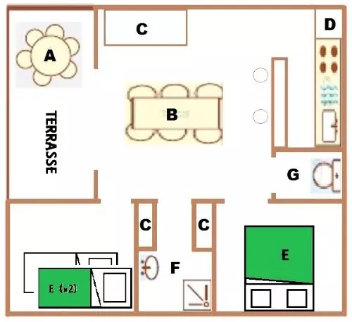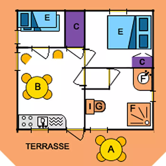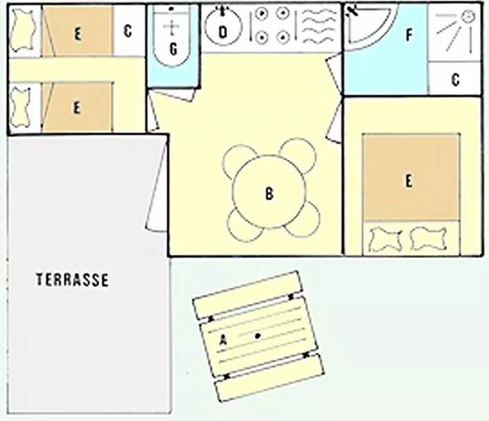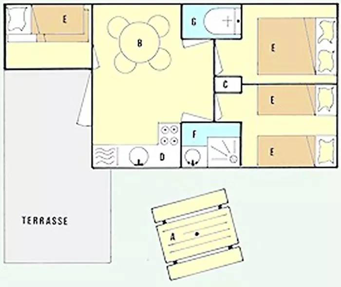 Bungalow 4 Pièces de 32m² pour 6 personnes, composé d'une cuisine équipée, d'un coin repas, d'une chambre avec un lit double, de deux chambres avec 2 lits simples chacune, d'une salle de douche, d'un WC séparé et d'une terrasse de 15m².