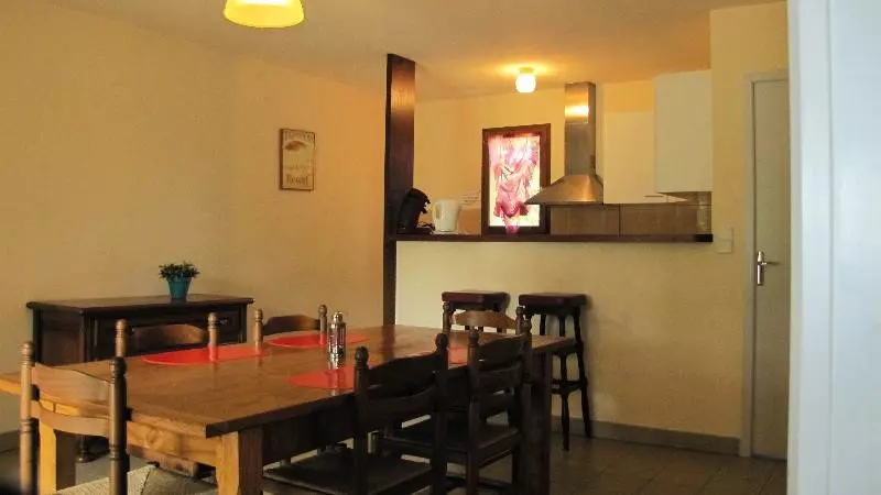 Gîte composé d'une cuisine équipée, d'une pièce de vie avec table, chaises et canapé convertible en lit 2 personnes, d'une chambre avec un lit double (140x200cm), d'une chambre avec deux lits simples (90x190cm), d'une salle d'eau avec douche et lavabo, de WC indépendants, de WC indépendants et d'une terrasse de 8m².