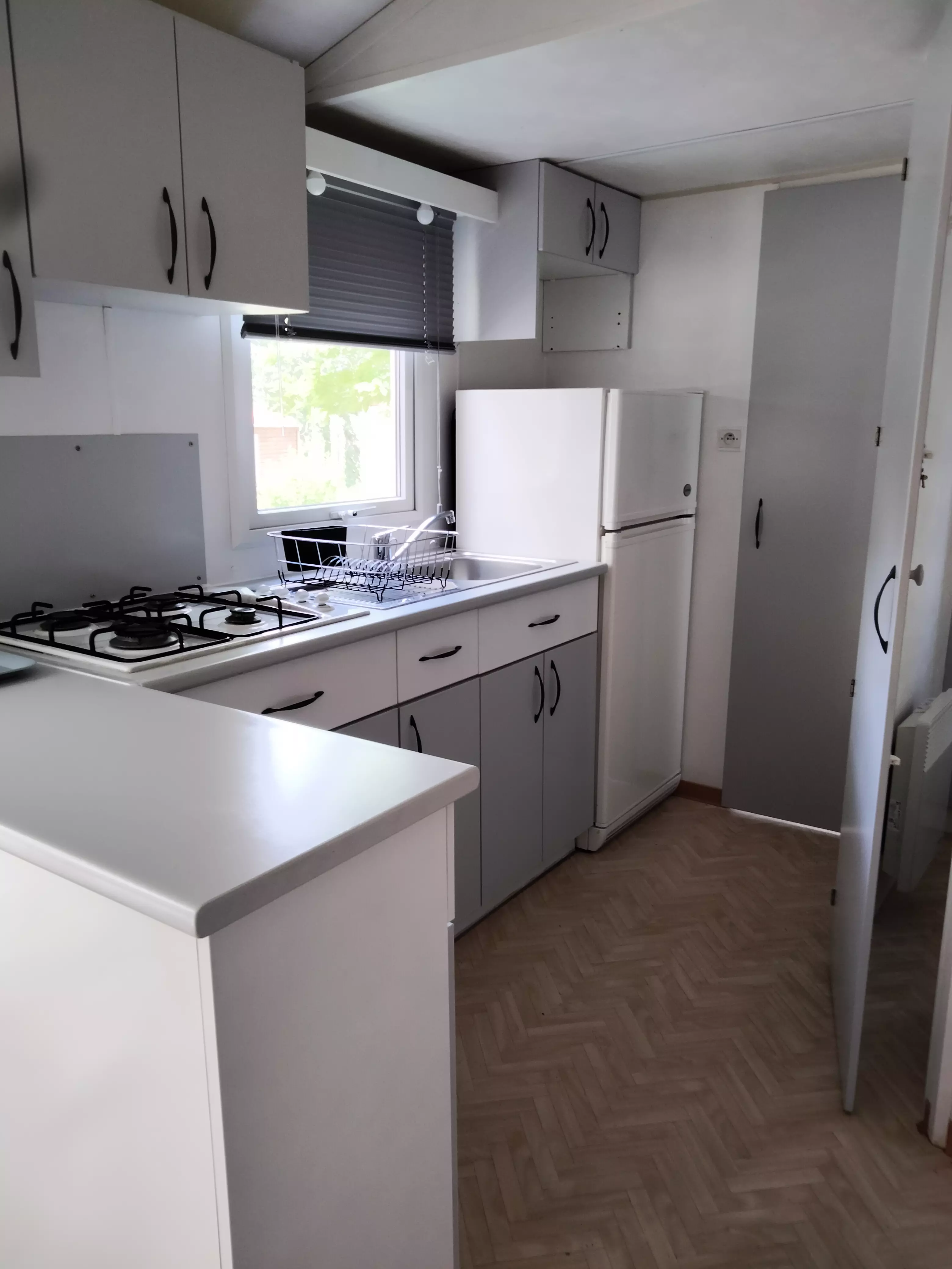 Le mobil home est équipé de plaques chauffantes au gaz et d'un réfrigérateur.