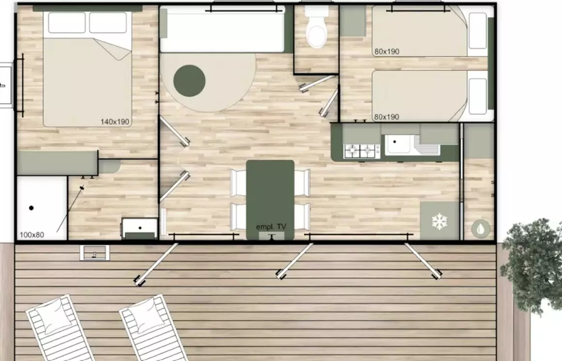 Mobil home Loggia Premium 3 pièces 4 personnes Climatisé avec :