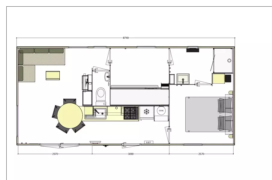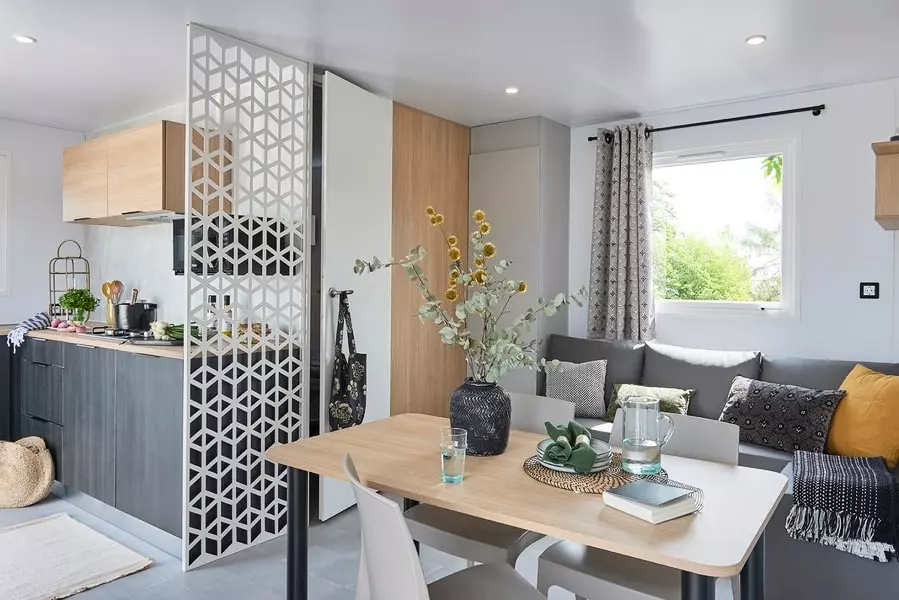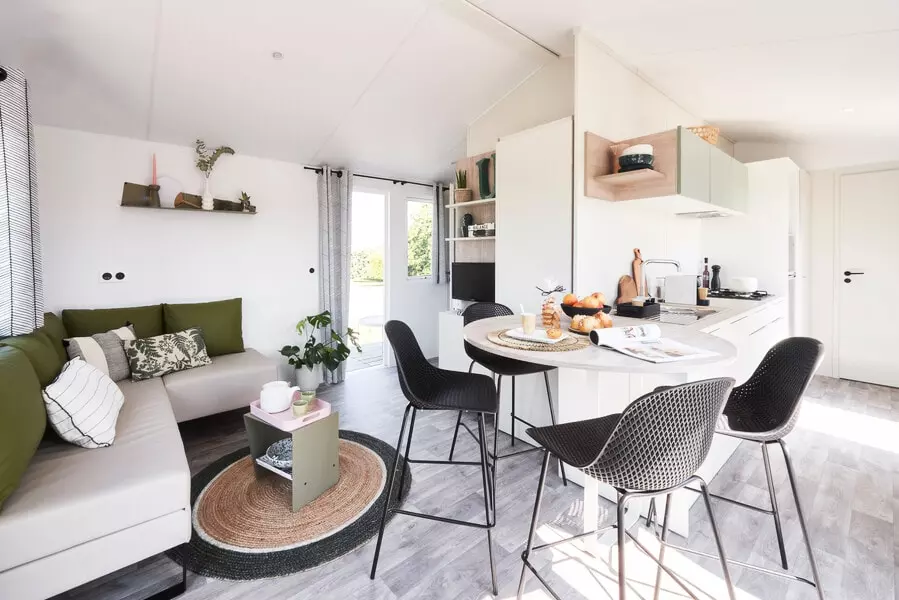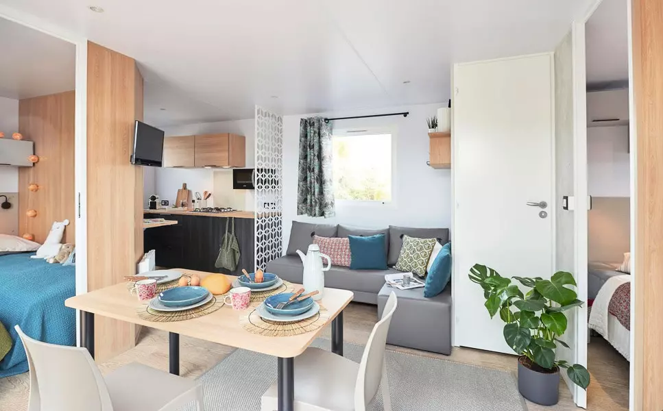 Cuisine équipée avec réfrigérateur/congélateur, coin salon/repas, 4 plaques gaz, micro-ondes, cafetière à filtre.
