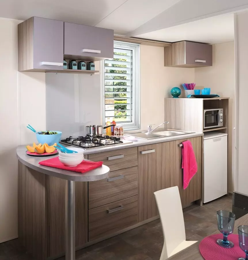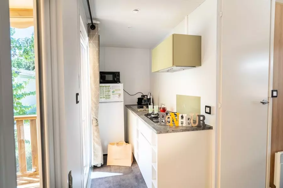 Cuisine équipée avec réfrigérateur, coin salon/repas, 4 plaques gaz, micro-ondes, cafetière à filtre.