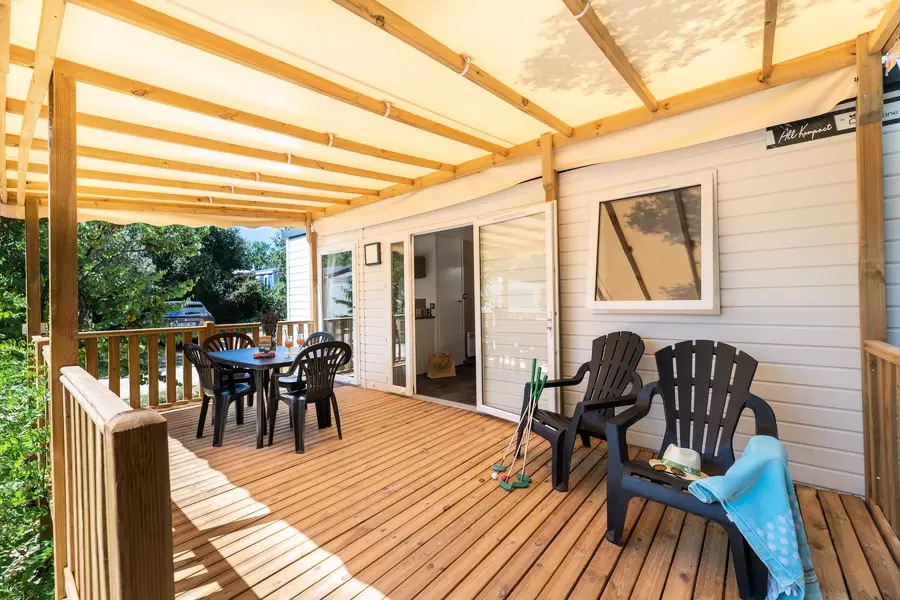 Terrasse couverte avec table, chaises de jardin et 2 chiliennes ou fauteuils