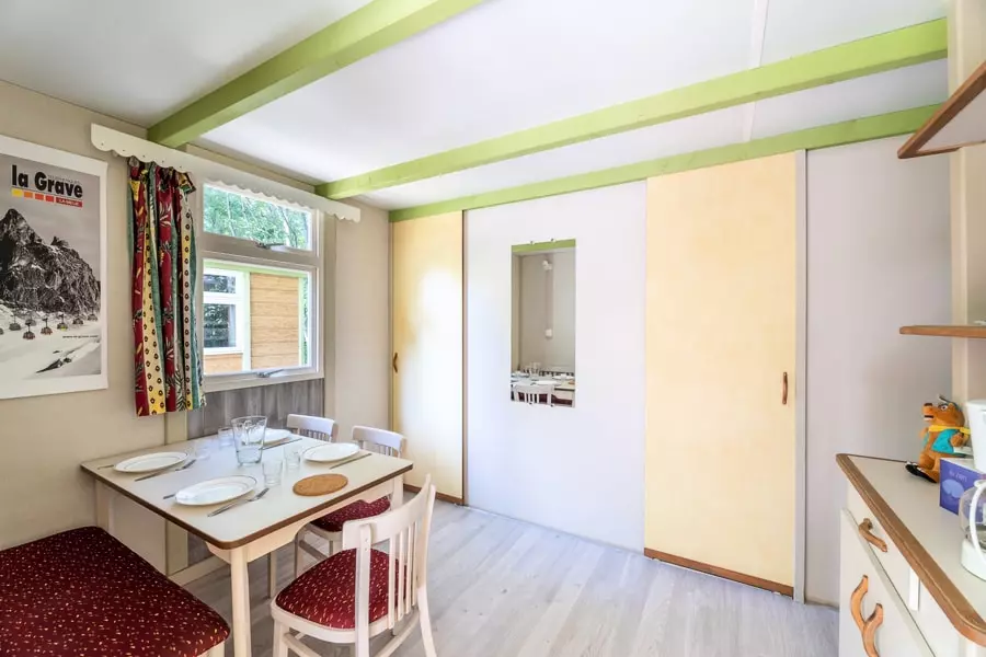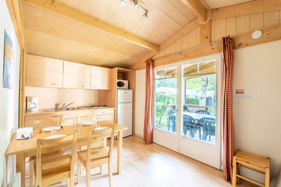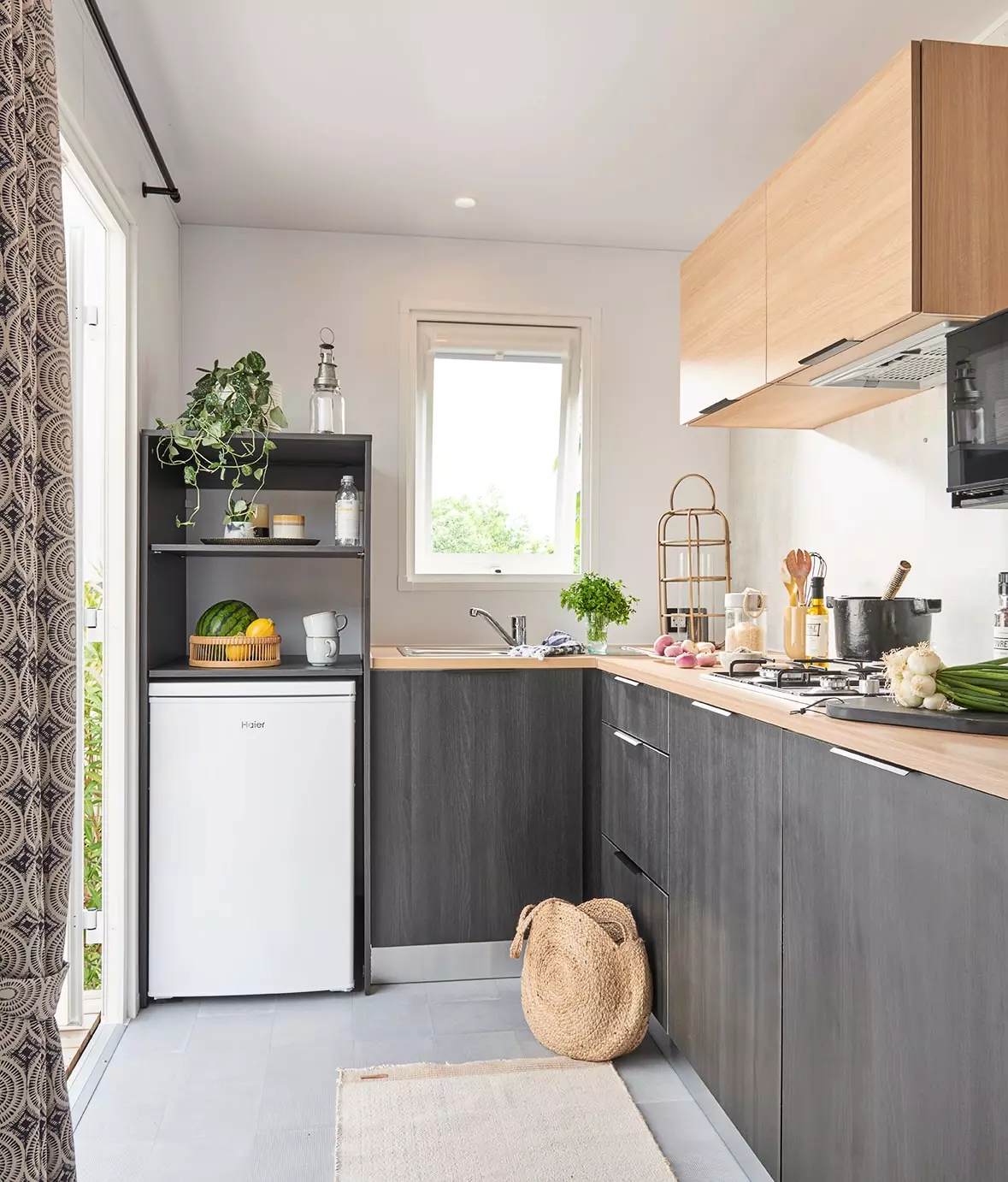 Cuisine équipée avec réfrigérateur, coin salon/repas, 2 plaques gaz, micro-ondes, cafetière à filtre.
