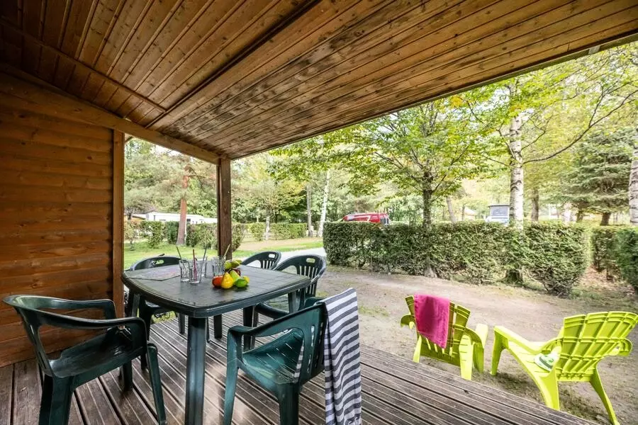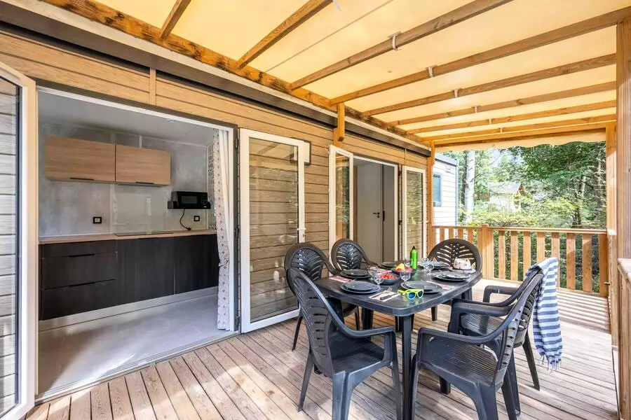 Terrasse couverte avec table, chaises de jardin, 2 chiliennes ou fauteuils.