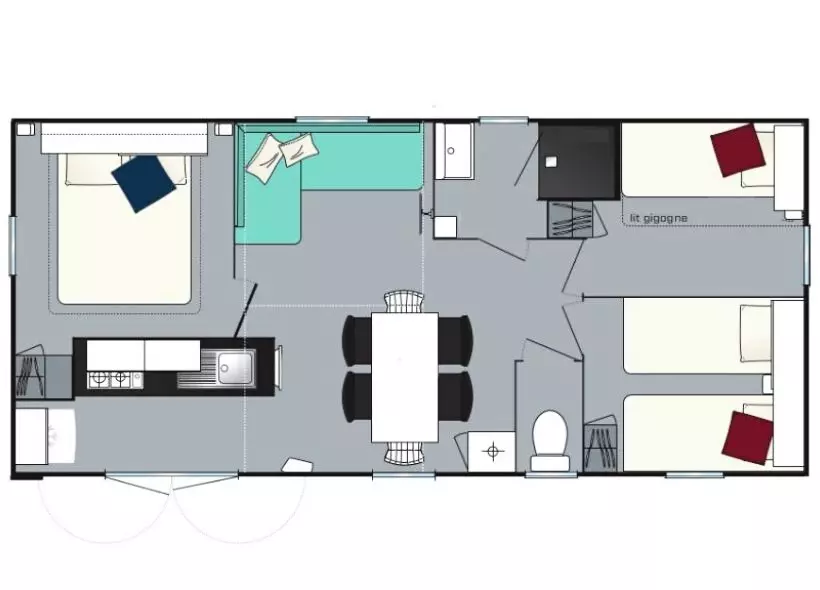 À noter : Les tailles de lits mentionnées sont non contractuelles. Il est possible d'avoir de légères différences de tailles selon les modèles de locatifs. La disposition des lits et la décoration peuvent également varier.