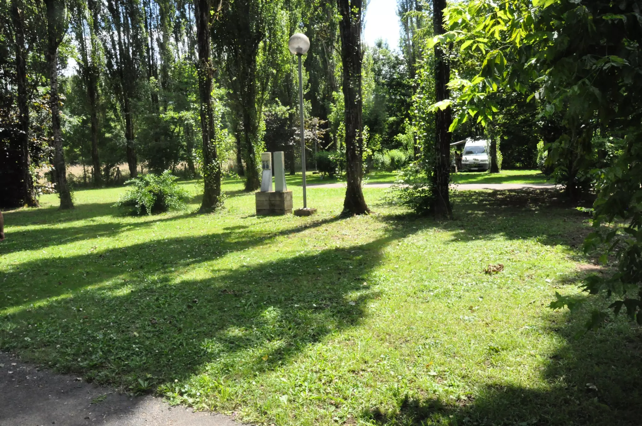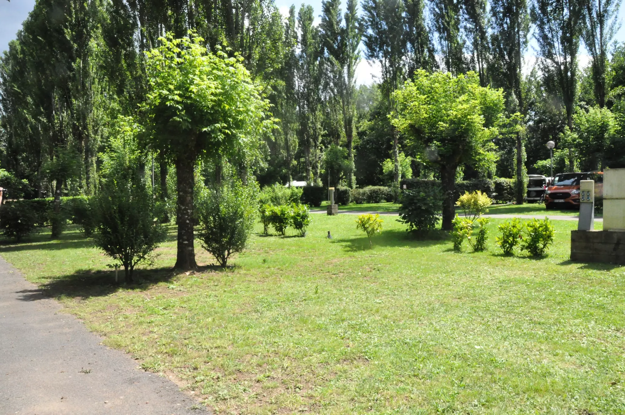 Les emplacements sont spacieux, plats et herbeux. Ils sont délimités par des arbres et des haies de hauteurs diverses. Six fontaines sont à disposition et le bloc sanitaire est central. Tous les emplacements sont alimentés en électricité 10 ampères (prévoir une rallonge électrique et adaptateur prise européenne).