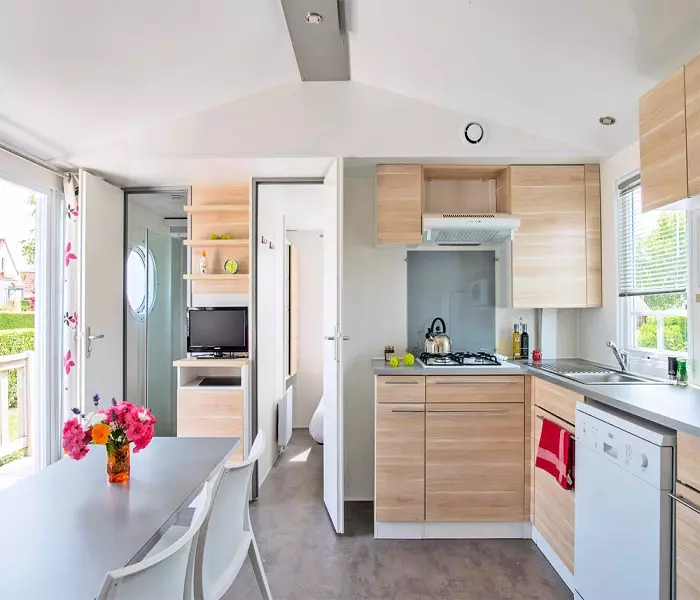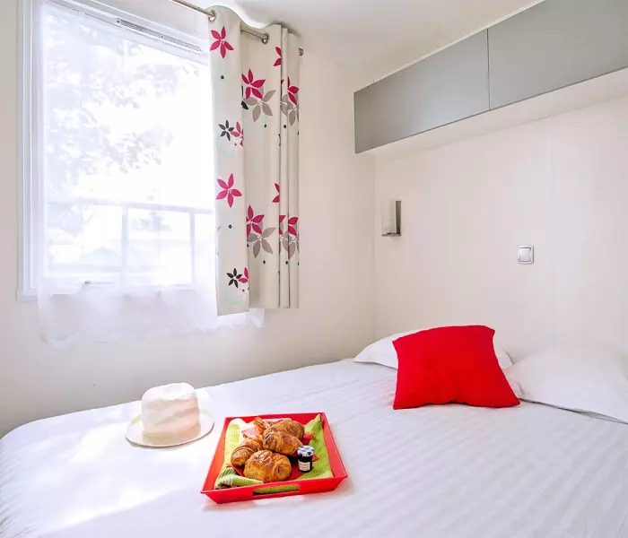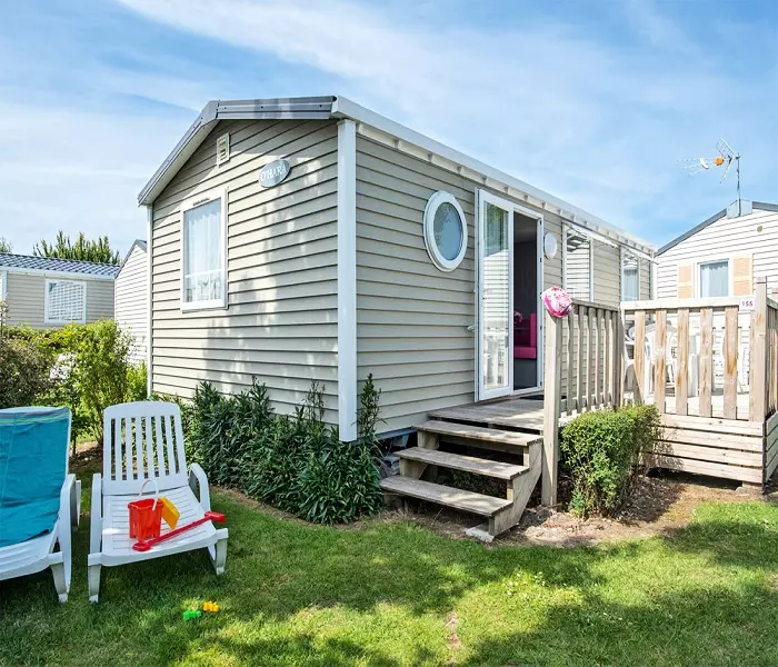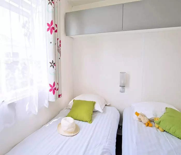 Cottage 3 pièces de 28 m² pour 4 personnes composé d'un coin cuisine, d'un coin séjour, d'une chambre avec 1 lit double (160x200), d'une deuxième chambre avec 2 lits simples (80x190), d'une troisième chambre avec 2 lits simples (80x190), d'une salle de douche avec WC et d'une terrasse.