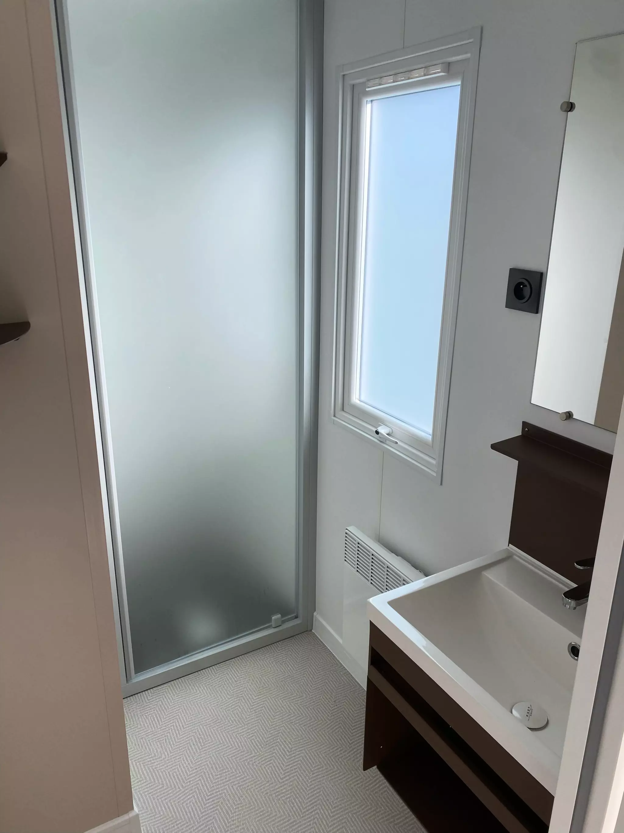 Mobil home 3 pièces 4 personnes de 32m², composé d'un salon, d'un coin cuisine equipé, d'une chambre avec un lit double (140x190), d'une chambre avec 3 lits simples, d'une salle de douche, de WC separés et d'une terrasse.