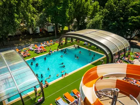 Piscines- Couverte et découvrable, Chauffée, Ouvert toute la saison, 4 toboggans, Avec pataugeoire, 1 bassin, 1 pataugeoire et 4 toboggans (extérieurs), De 10:00 à 20:00, Gratuit