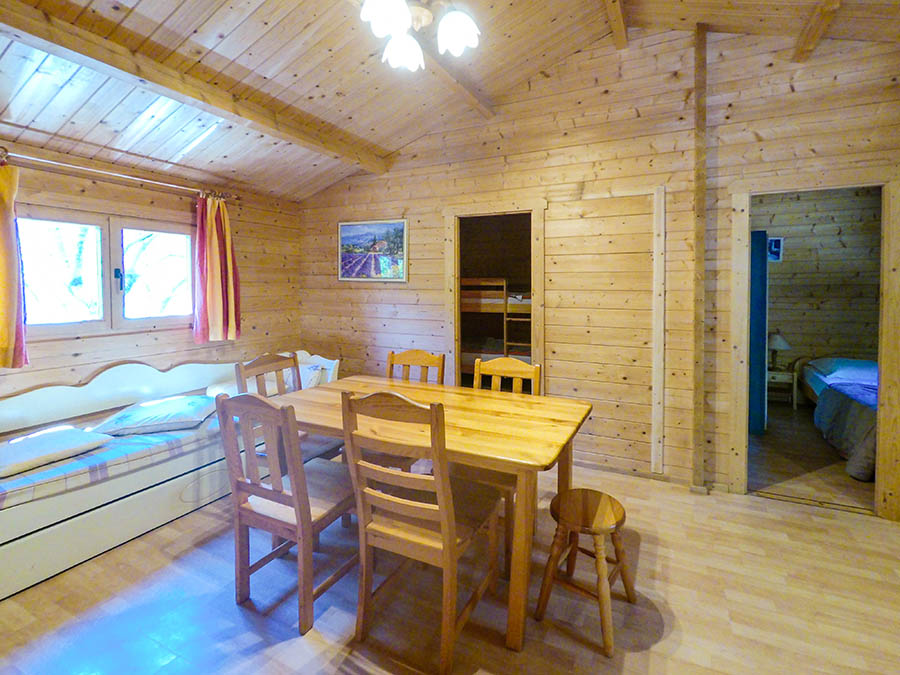 • Chalet "Valinco" 45 m² (1 à 6 personnes, 2 chambres) : une chambre avec un lit double en 140x200 et une 2ème chambre avec un lit superposé et un lit simple, un canapé-lit dans le séjour.
