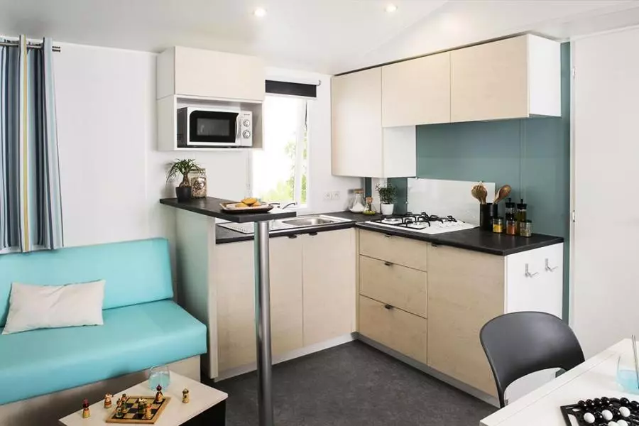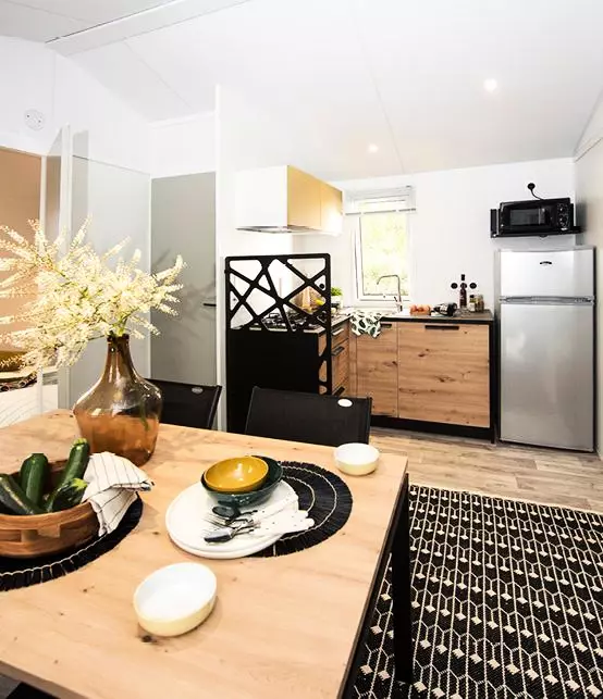Le Mobil Home comprend une cuisine avec frigo / congélateur, plaques gaz, lave-vaisselle, vaisselle, micro-onde et grille-pain. Le logement dispose également d'une télévision dans le salon et d'une terrasse couverte avec salon de jardin.