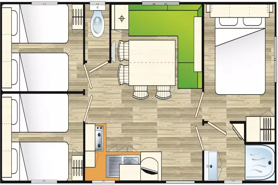 Mobil Home 4 Pièces 6 Personnes Climatisé, de 30 m² composé d'une cuisine équipée, d'un salon coin repas, d'une chambre avec 1 lit double (140x190), de deux chambres avec chacune 2 lits simples (80x190), d'une salle de bains avec douche, de WC séparés et d'une terrasse couverte.