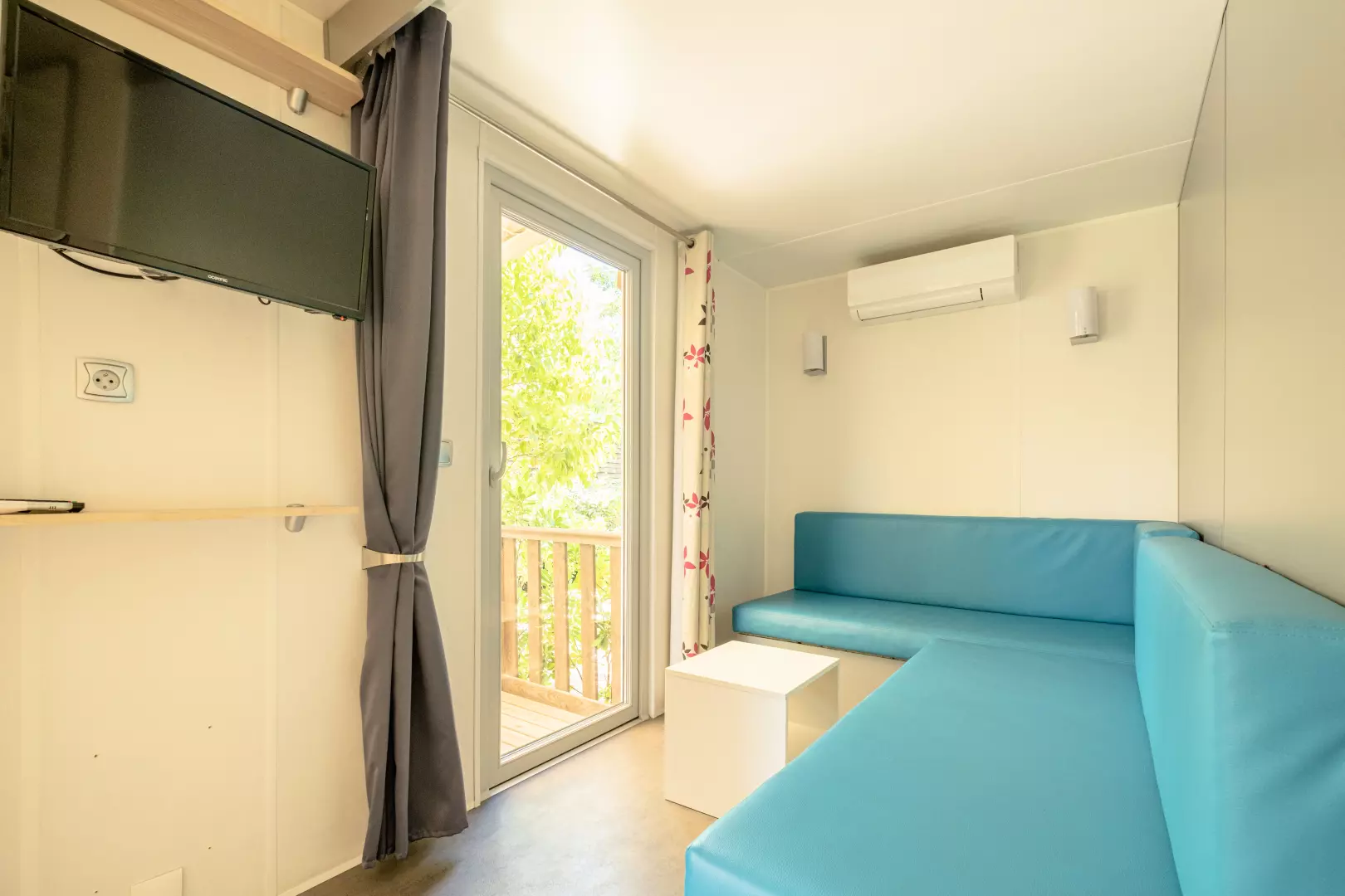 Lodge confort 3 pièces 4 personnes de 32m² climatisé, composé d'un coin salon, d'un coin cuisine équipé, d'une chambre avec un lit double, d'une chambre avec deux lits simples, d'une salle de douche, de WC et d'une terrasse en bois.