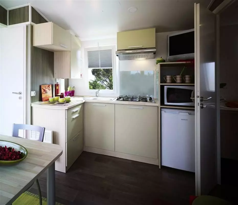• La cuisine est équipée de plaques de cuisson (4feux), d'un réfrigérateur-congélateur (varie selon modèle), d'un micro-ondes et d'une cafetière.