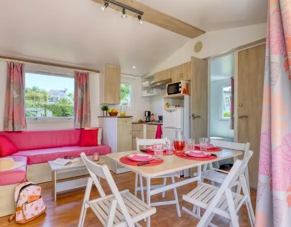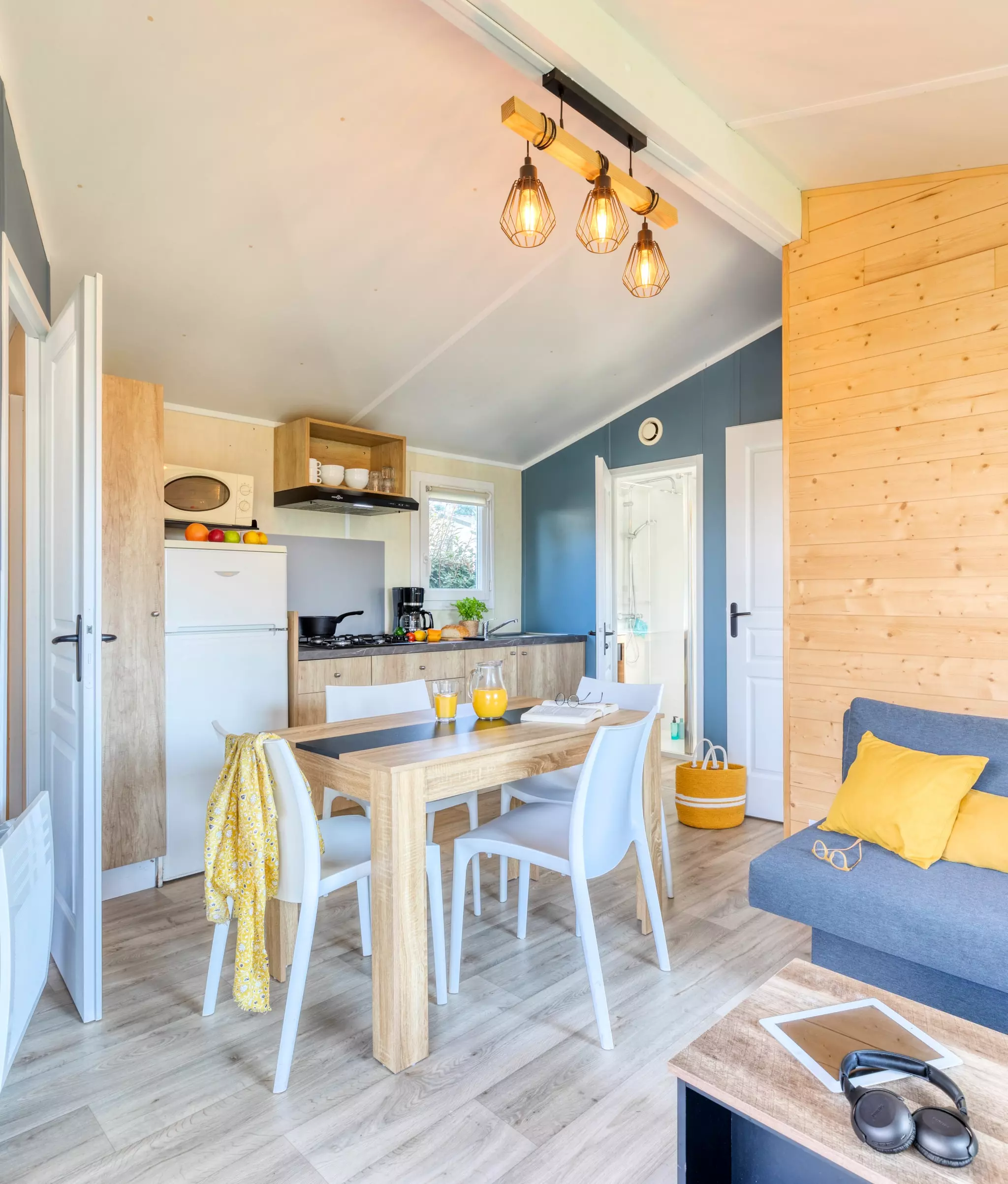 Le séjour comprend 1 canapé convertible (possibilité de 2 couchages supplémentaires), un coin repas et cuisine équipée (table de cuisson, micro-ondes, réfrigérateur-congélateur, cafetière filtre).