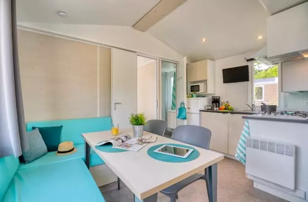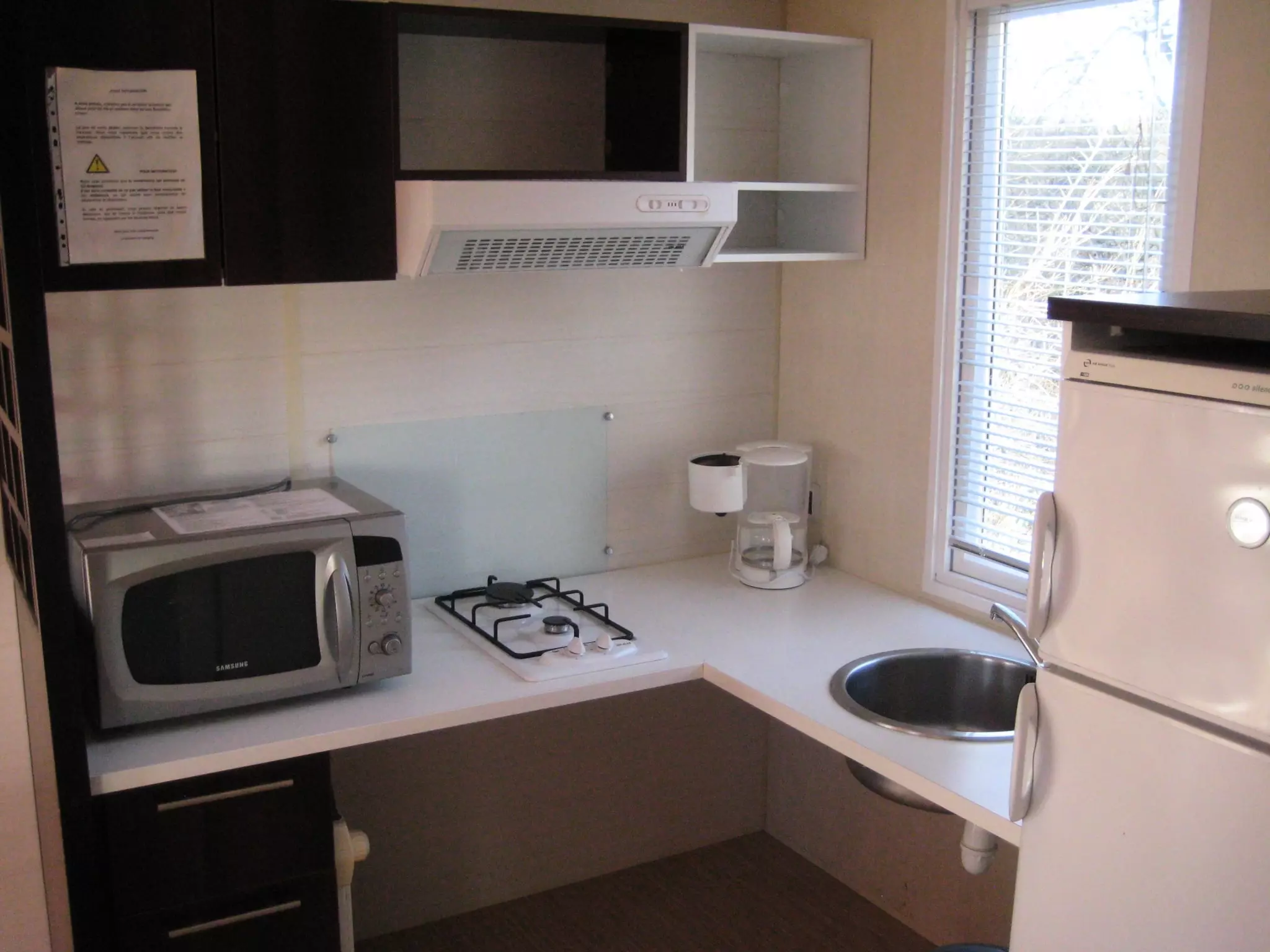Le Mobil Home comprend un coin cuisine équipé avec table de cuisson, micro-ondes, frigo-congélateur, cafetière, ustensiles de cuisine et vaisselle adaptée au nombre de personnes dans le logement.