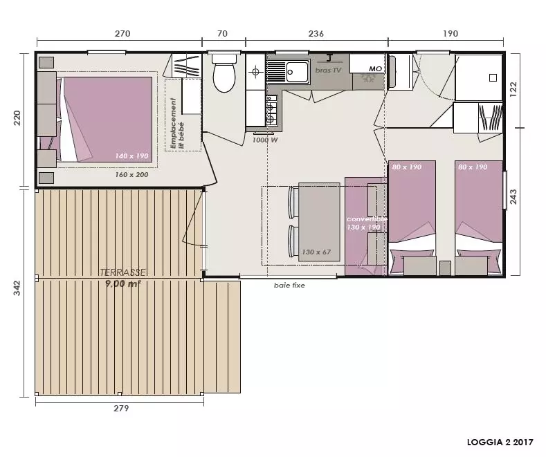 À noter : Les tailles de lits mentionnées sont non contractuelles. Il est possible d'avoir de légères différences de tailles selon les modèles de locatifs. La disposition des lits et la décoration peuvent également varier.