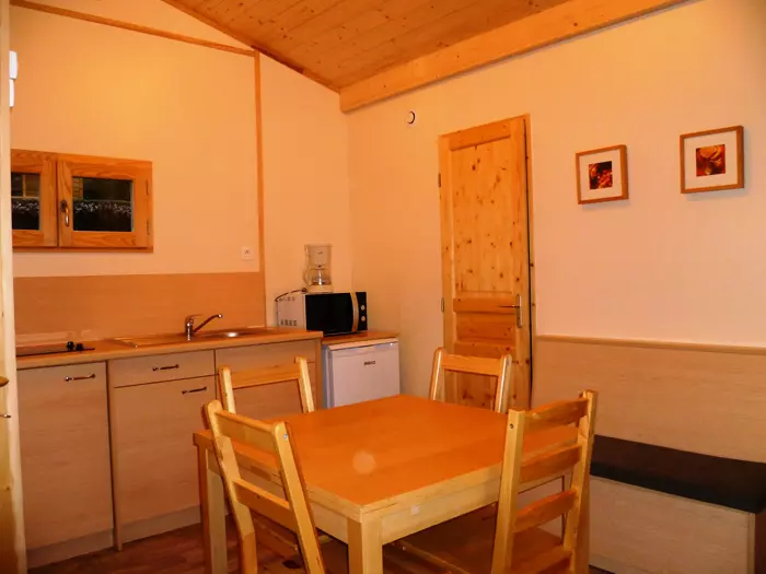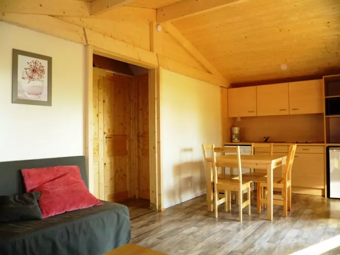 Le chalet Eco-nature 3 Pièces 4 Personnes comprend une pièce à vivre avec coin cuisine équipé, une chambre avec lit double, une chambre avec 2 lits simples, un coin douche avec lavabo. WC séparé.