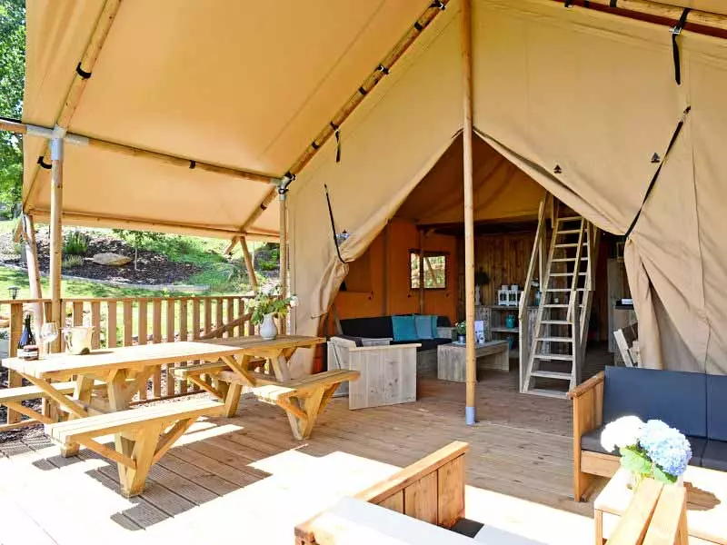 Tente 2 Personnes de 8m² composé d'un coin cuisine équipé, d'un coin chambre, d'une petite terrasse.