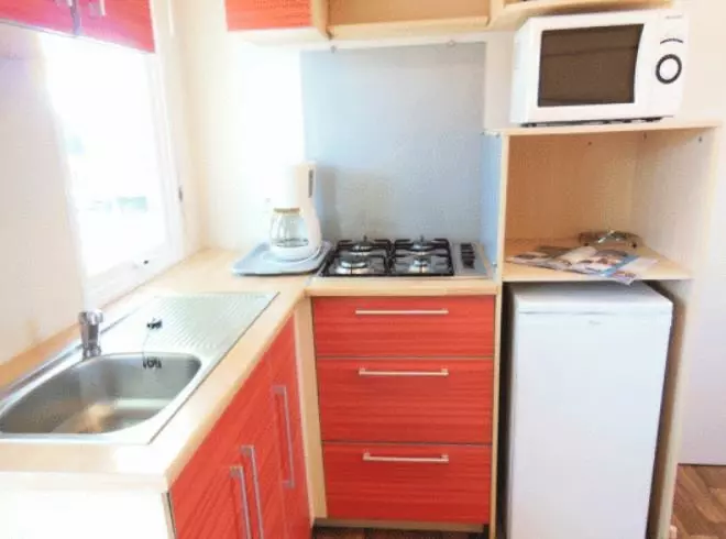 Le Mobil Home dispose de : 1 Chambre avec 1 lit double 140X190cm. 1 Chambre avec 2 lits simples 80X190cm. 1 Salle de Bain avec douche, lavabo, WC séparés. 1 Cuisine équipée d'un frigo, une gazinière 4 feux, micro-ondes, cafetière électrique. 1 Salon avec table, chaises et banquette convertible pour 2 personnes 130X190cm. 1 Terrasse en bois avec un salon de jardin et chaises longues/chiliennes. Infos : Les couvertures ou couettes et oreillers sont fournis. Le linge de lit, le linge de toilette et les produits d'entretien ne sont pas fournis. Photos non contractuelles