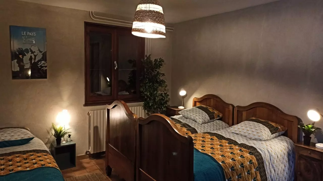 -Rez de chaussée: d'un garage avec un local de rangement( un réfrigérateur et un congélateur), une buanderie avec une chaudière avec un point d'eau, un lave-linge, une chambre composé de 4 lits simples en 90 et un grand placard et un accès direct au jardin(porte-fenêtre) , 1 salle d'eau, 1 WC séparé un grand escalier pour accéder à l'étage.