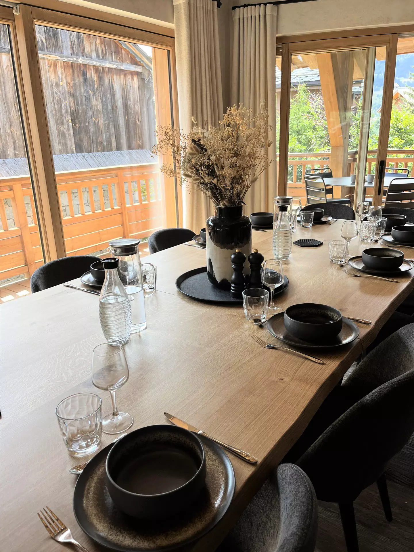 Salle à manger : Une longue table à manger de style traditionnel, pouvant accueillir tout le monde confortablement.