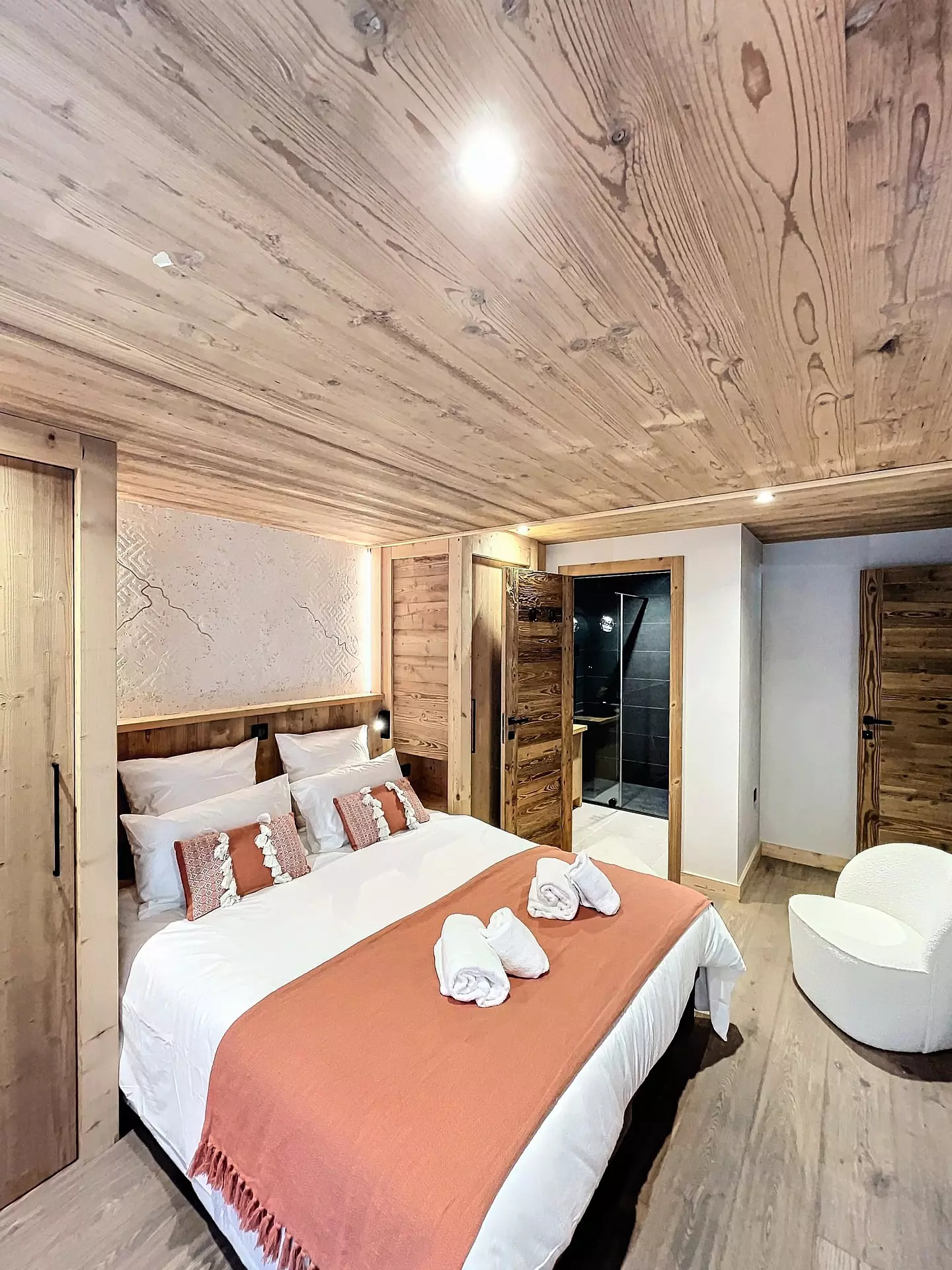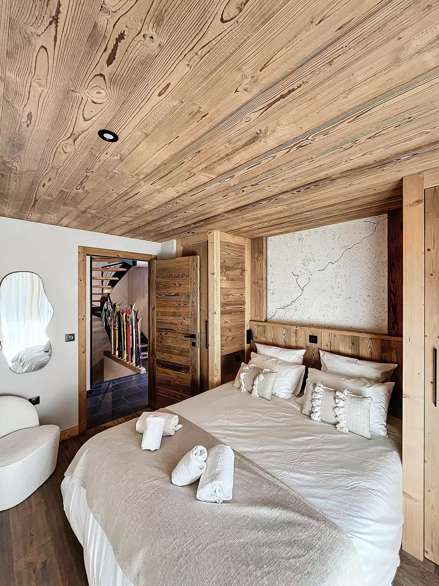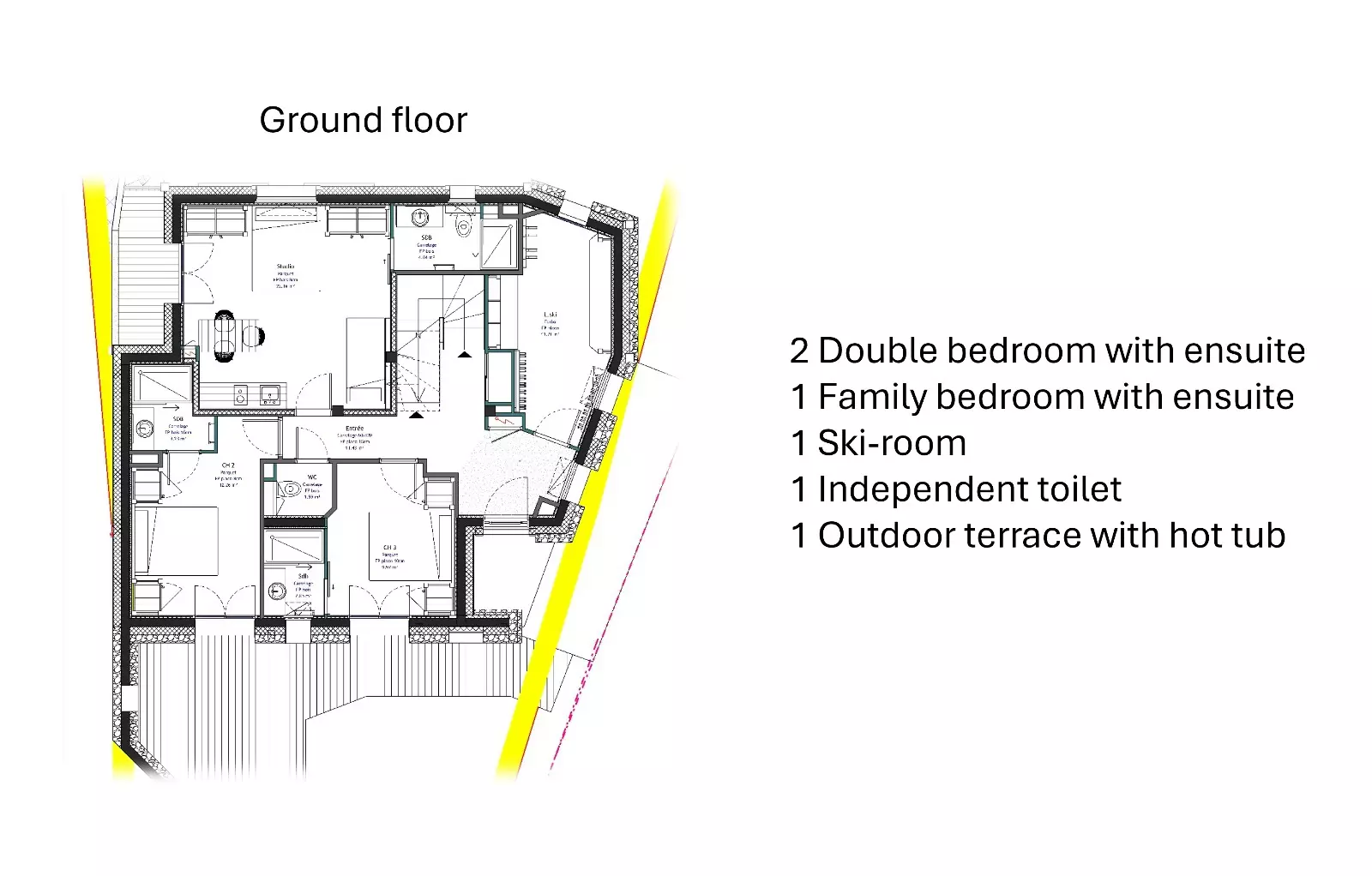 Ce chalet de 250m² s'étend sur 3 niveaux + 1 mezzanine. Ce chalet pour 14 personnes est composé de 5 chambres, 5 salles de bains avec deux couchages supplémentaires dans une chambre. Voici les détails :