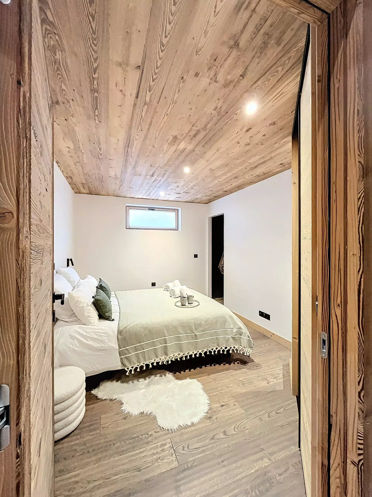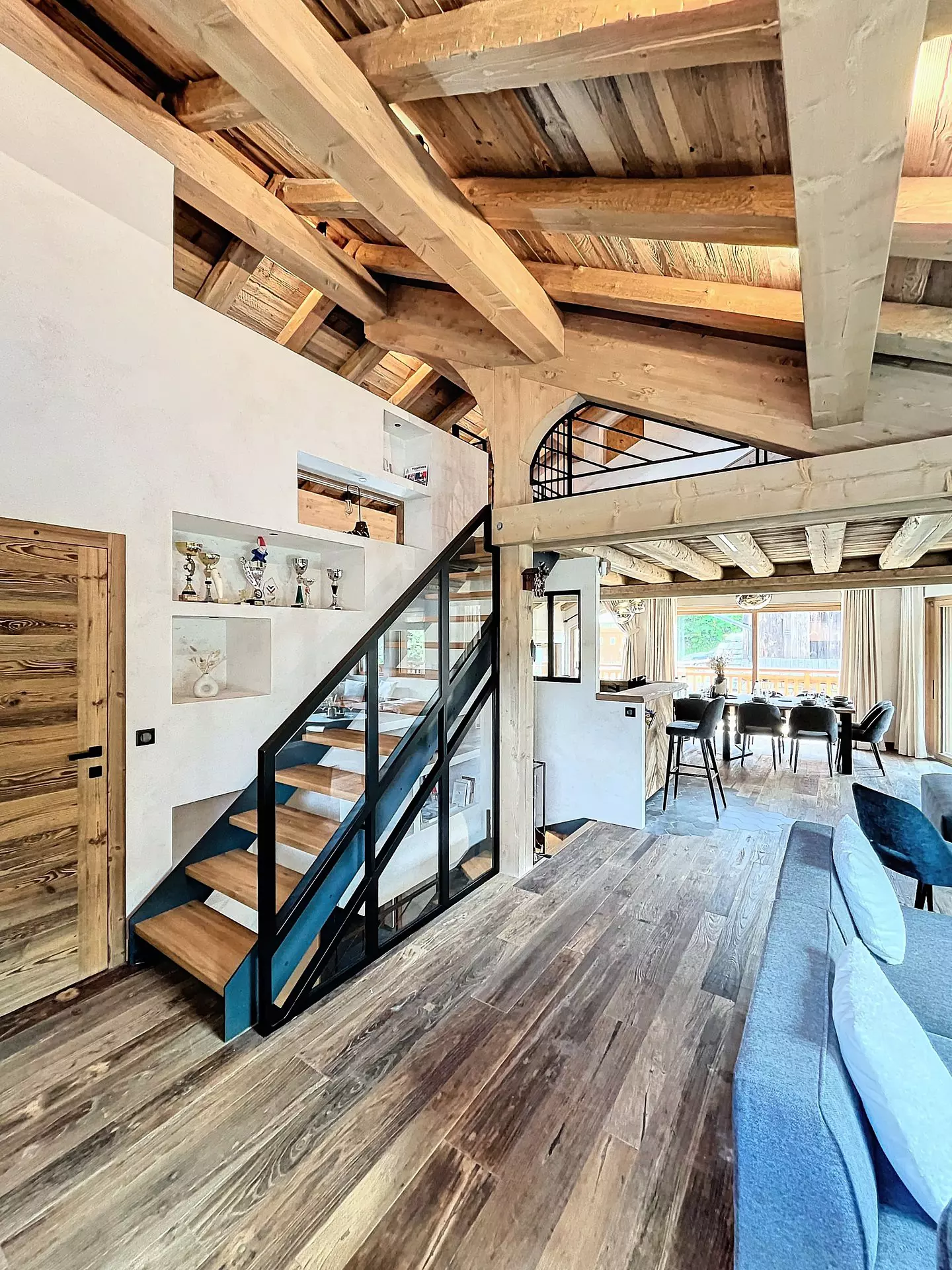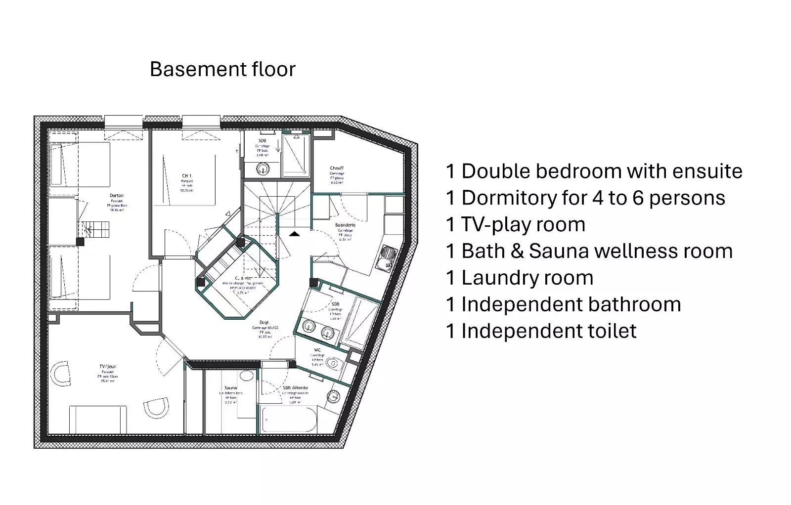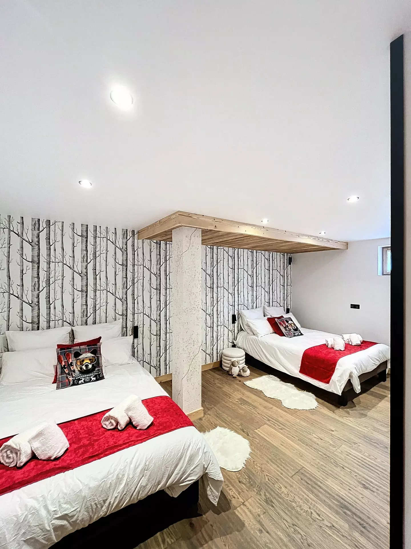 Ce chalet de 250m² s'étend sur 3 niveaux + 1 mezzanine. Ce chalet pour 14 personnes est composé de 5 chambres, 5 salles de bains avec deux couchages supplémentaires dans une chambre. Voici les détails :