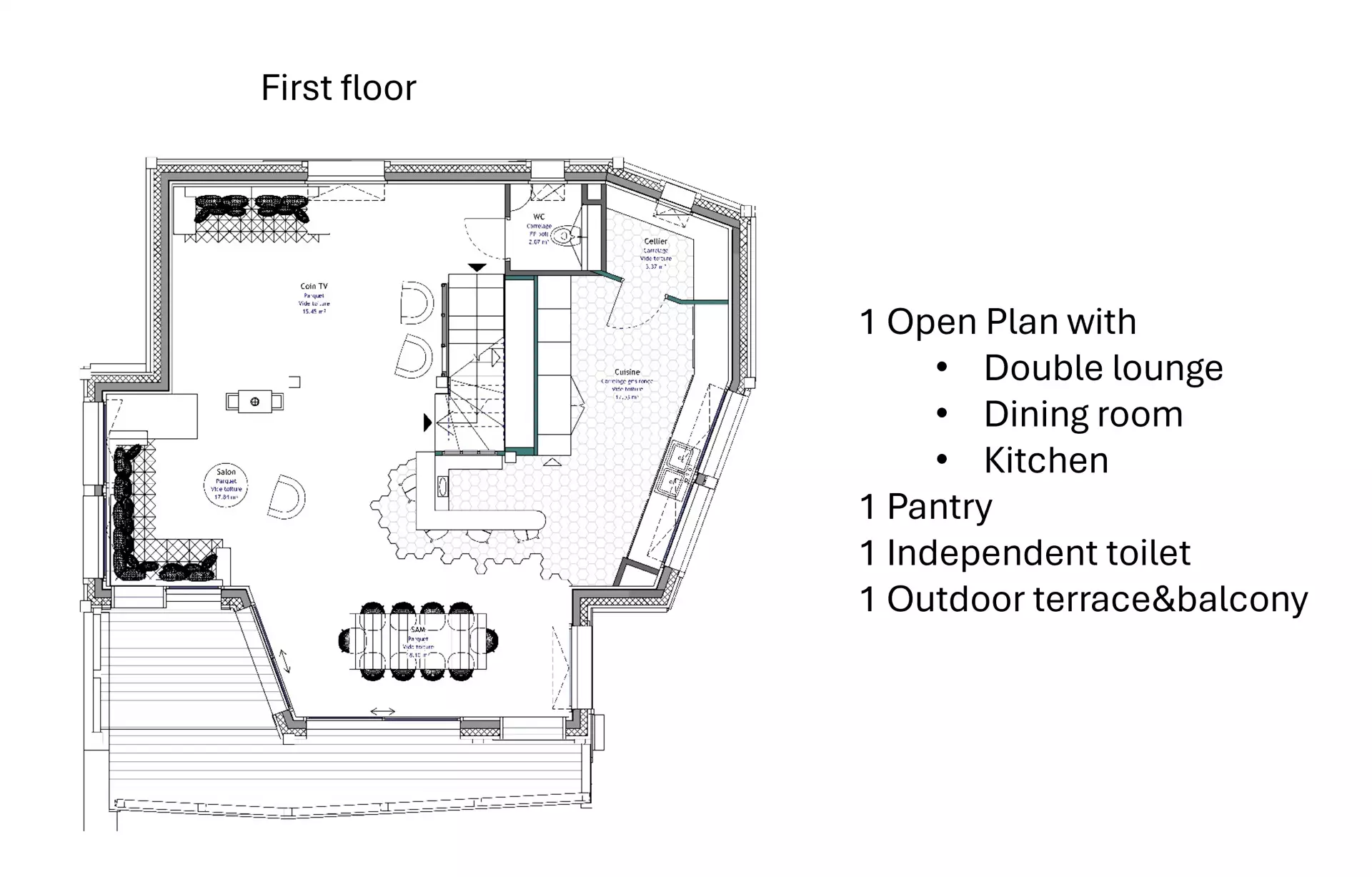 Ce niveau s'ouvre sur une grande terrasse et un balcon, offrant une vue imprenable pour admirer le coucher de soleil. Il est agencé en plusieurs espaces distincts :