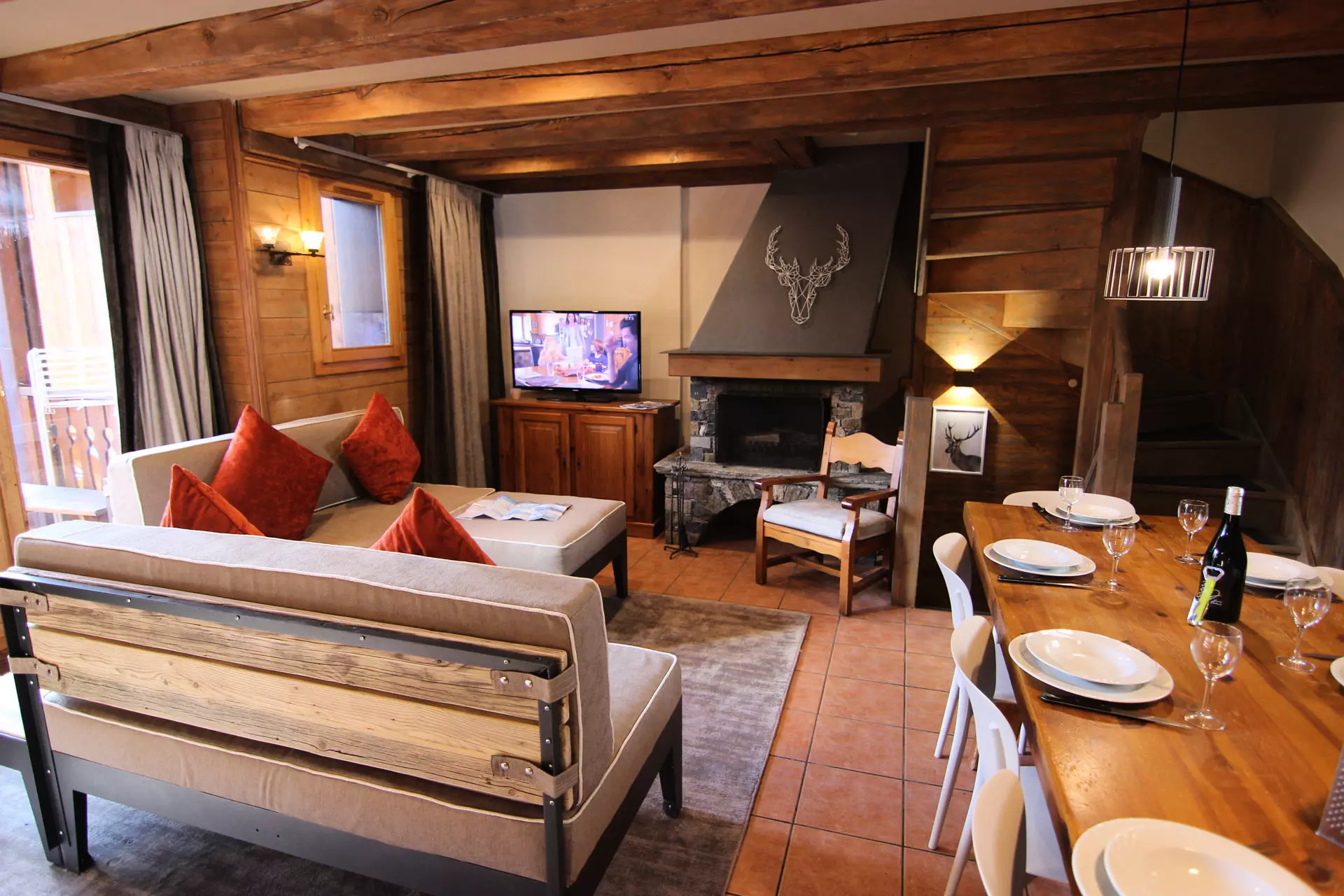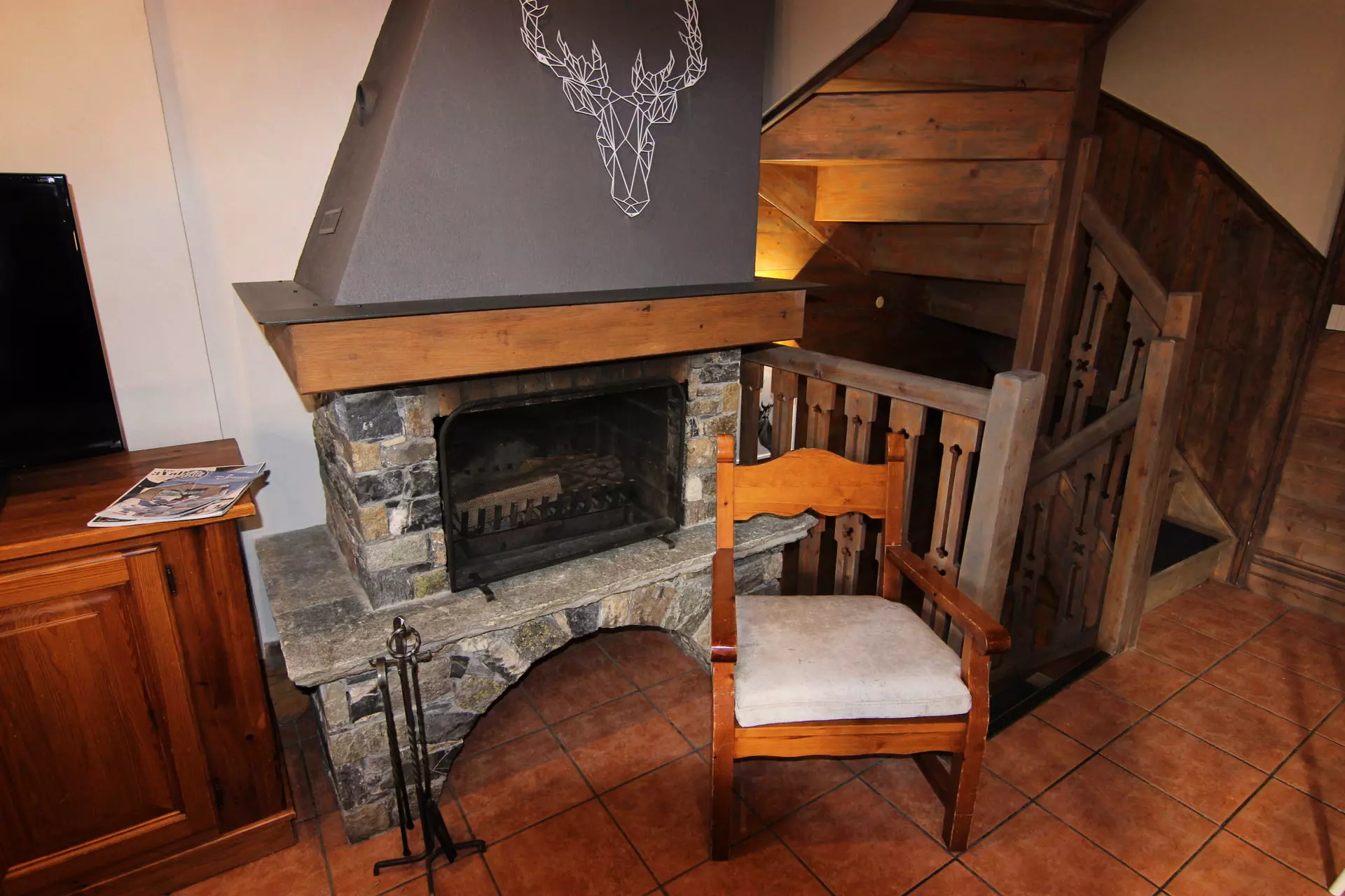 Salon: canapé, cheminée, télévision, coffre-fort, coin repas.
