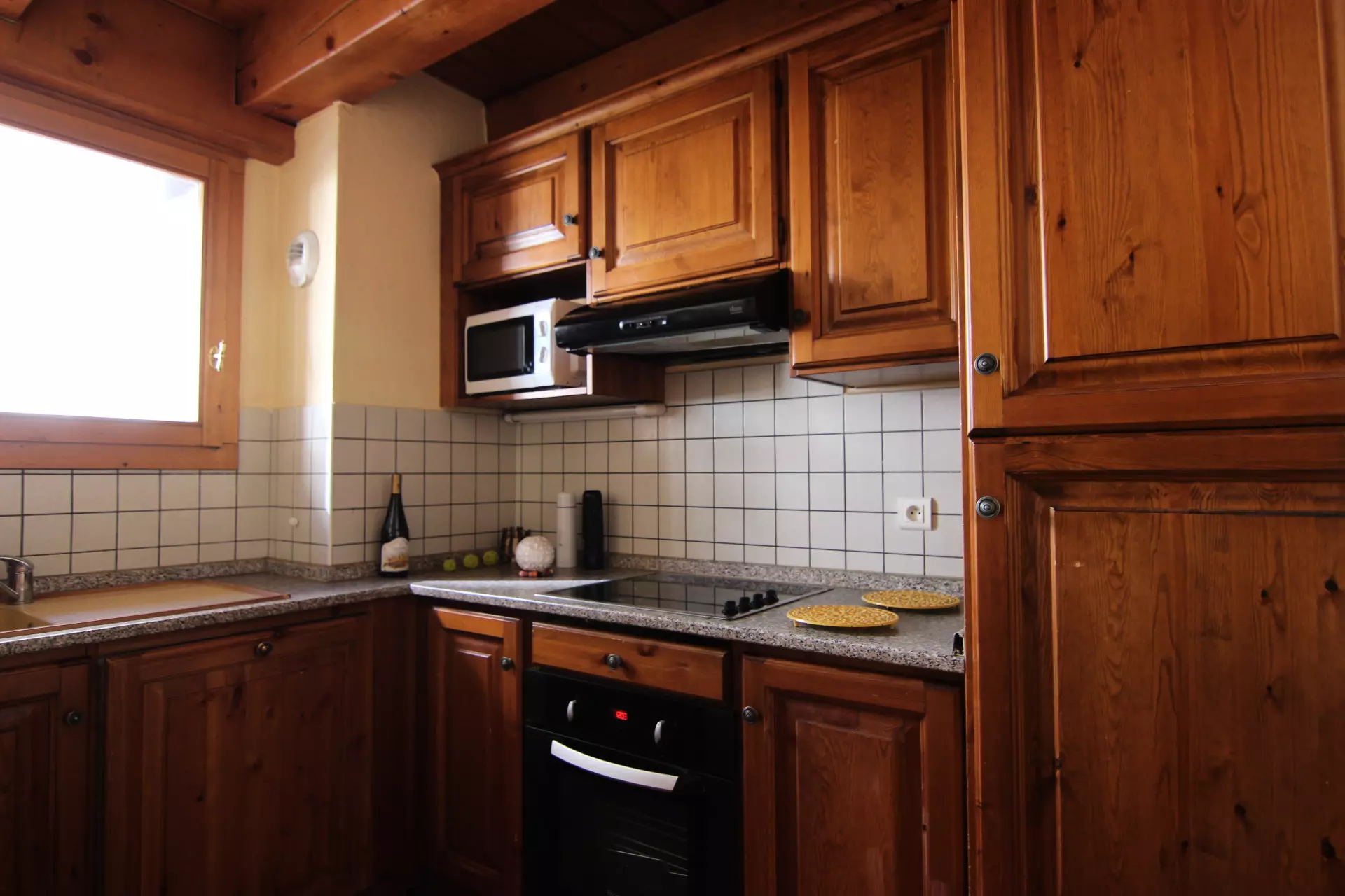 Cuisine: four, micro-onde, plaque de cuisson quatre feux, lave-vaisselle et réfrigérateur/congélateur.