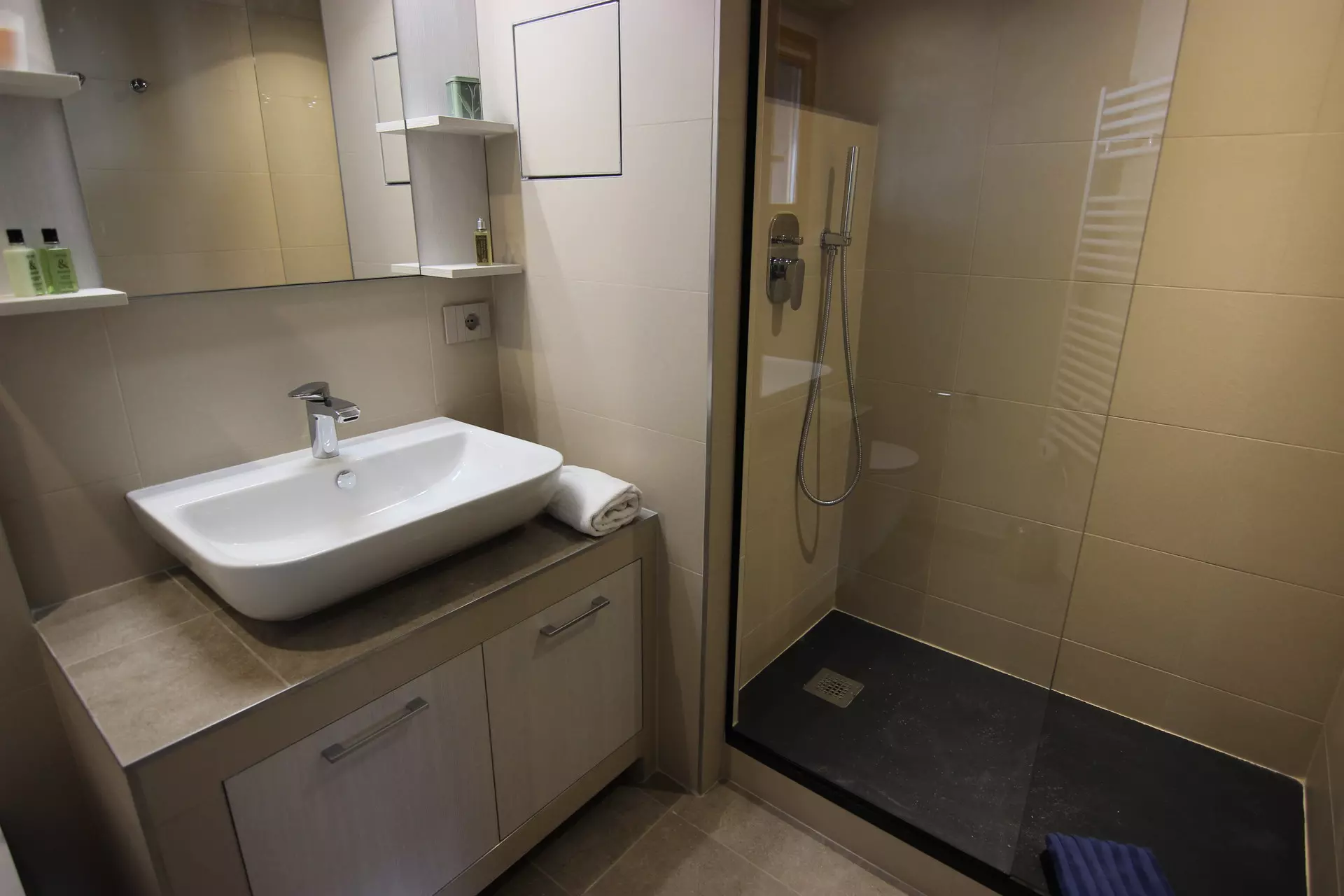 Salle de douche: douche, lavabo.
