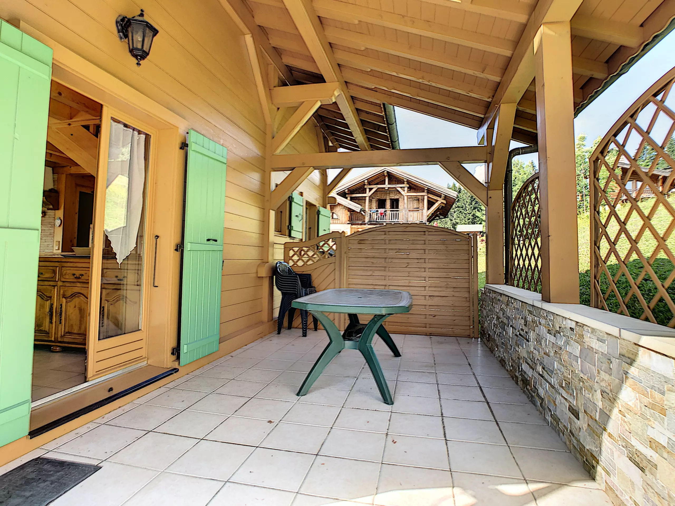 Détendez-vous sur la terrasse en profitant des extérieurs après une journée d'aventures en montagne. Le parking extérieur devant le chalet assure la sécurité et la tranquillité d'esprit pour votre véhicule.