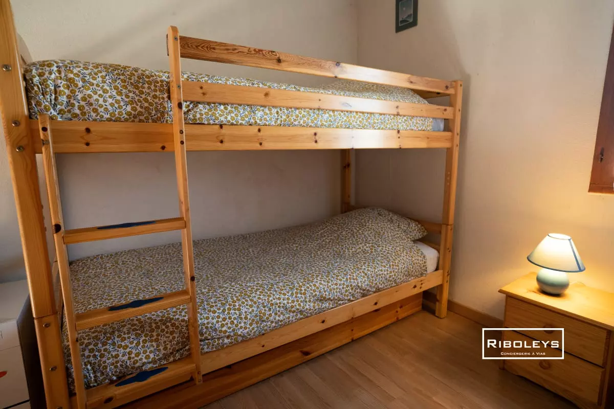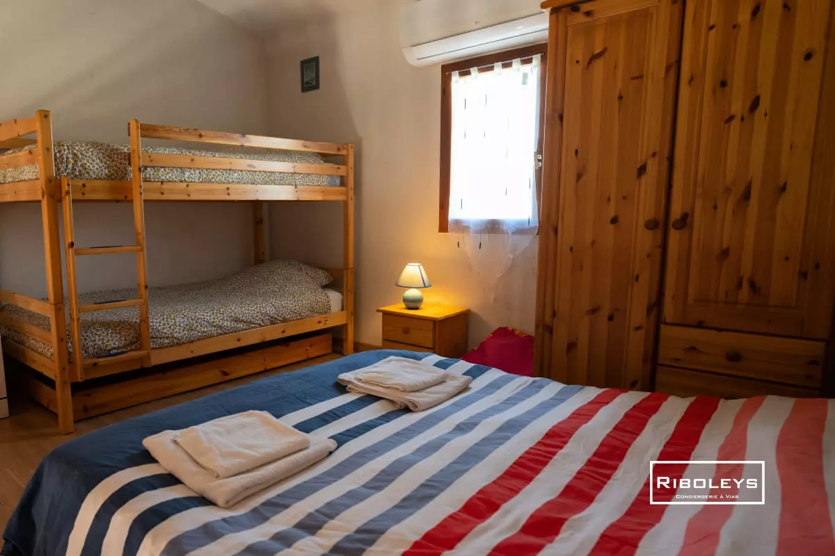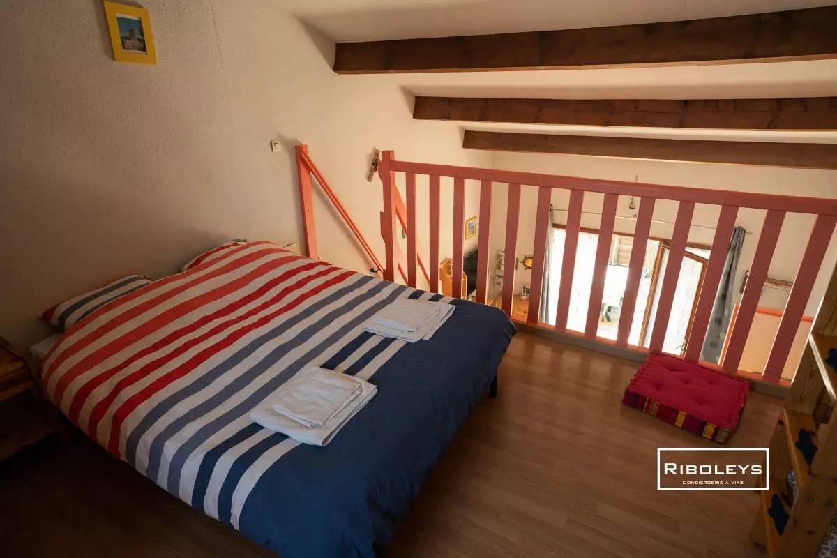 Côté nuit, le logement offre une chambre en rez-de-chaussée équipée d'un lit double (140 cm), parfaite pour des nuits paisibles. Une mezzanine climatisée, ouverte sur la pièce de vie, dispose de lits superposés (80x190 cm) ainsi que d'un canapé BZ (140x190 cm), offrant des couchages supplémentaires pour accueillir famille ou amis.