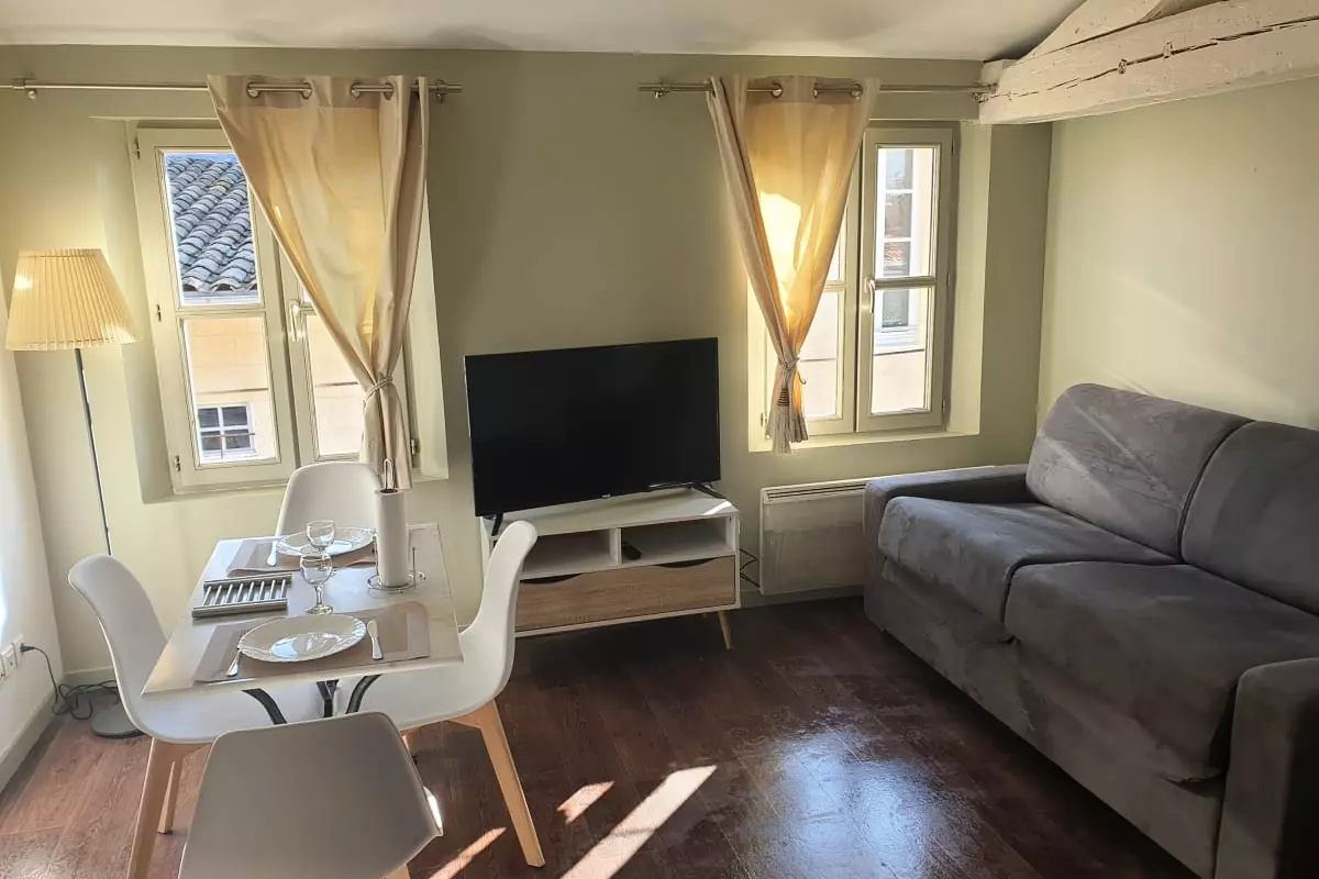 Situé à Avignon, le logement est moderne et fonctionnel. Il est localisé au 4ème étage sans ascenseur et est composé d'une chambre avec un lit double, d'une salle de bain et d'un bel espace salon.
