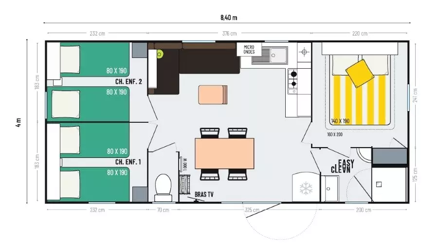 Venez dans l'un de nos mobil-homes Premium 2 chambres pour 4 personnes avec lave-vaisselle et lit de 160 cm. Ce Mobil-Home est équipé d'une grande terrasse de 4,5m x 3m pour passer de bons moments de plaisir en famille ou entre amis. Vous séjournerez dans nos espaces plein de verdure, à la fois dans le calme et avec des animations à votre disposition au sein du camping.