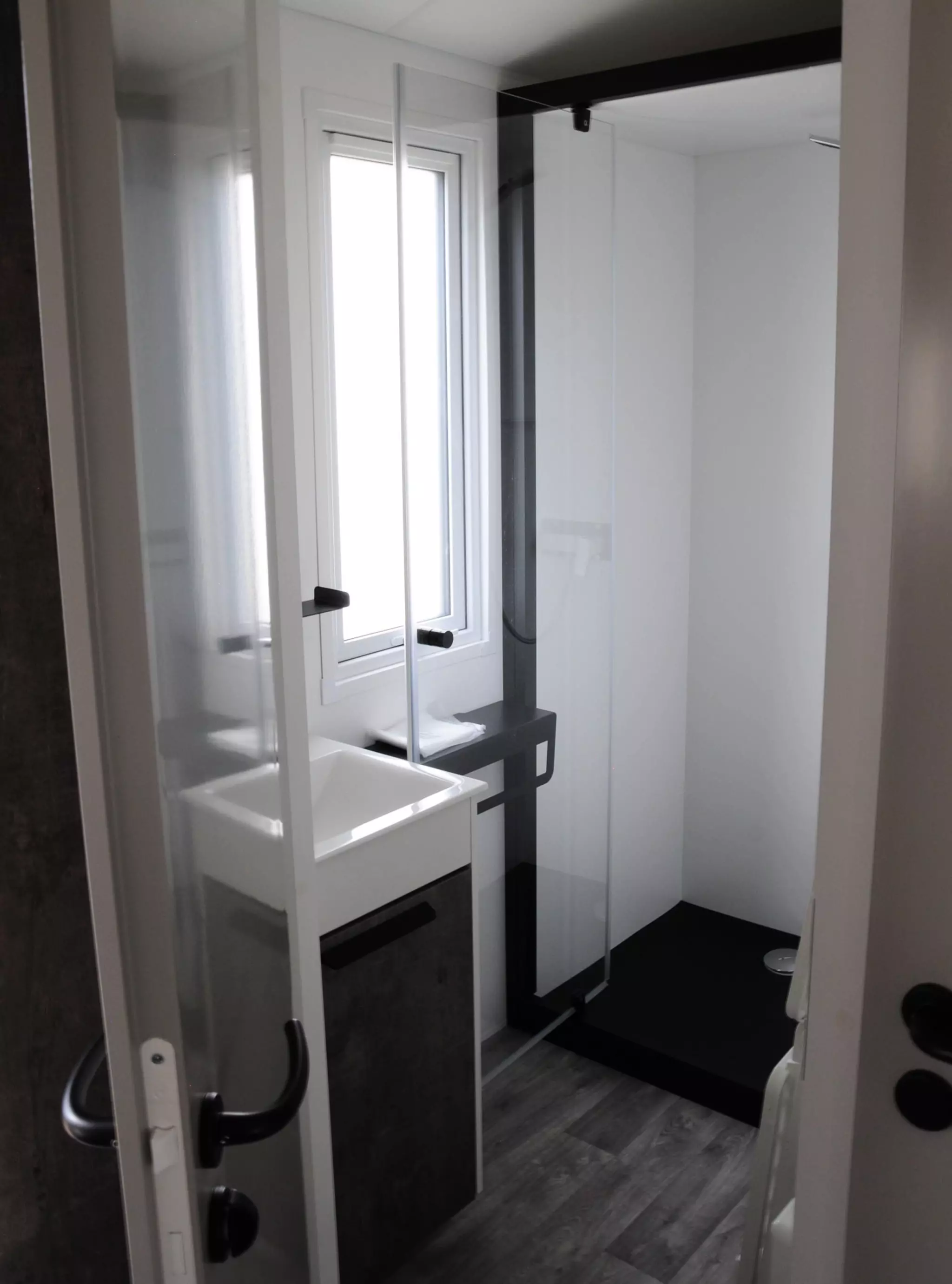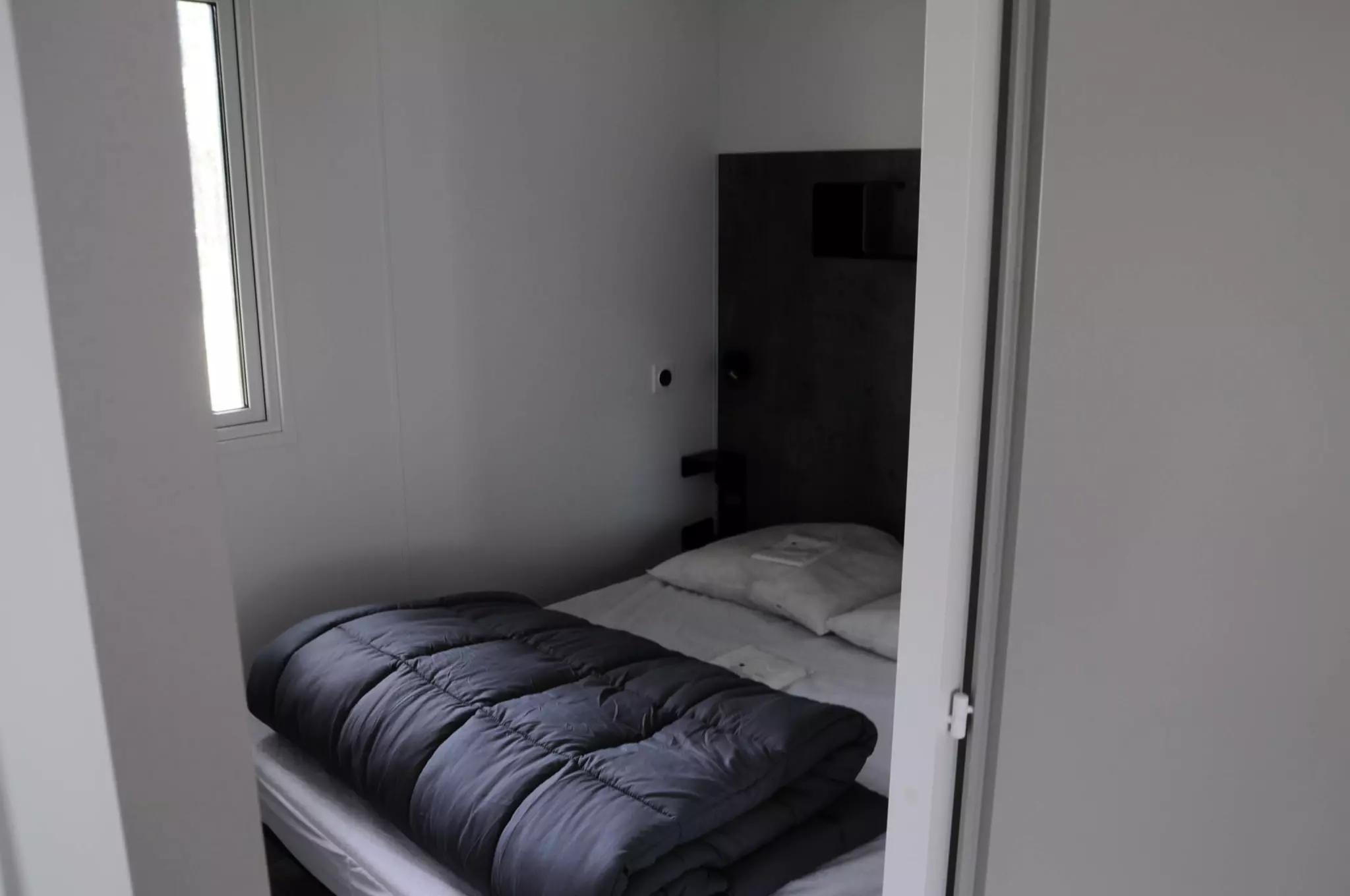 Lodge Hoëdic sur pilotis de 21 m² sans sanitaires pour 5 personnes, 2 chambres, 1 chambre avec 1 grand lit de 140cm et 1 chambre avec 3 petits lits dont 1 superposé, couettes et oreillers fournis, kitchenette équipée avec plaque 2 feux gaz, réfrigérateur table top, cafetière, bouilloire, terrasse couverte de 11m², bain de soleil et parking privatif. Les animaux ne sont pas acceptés dans les lodges.
