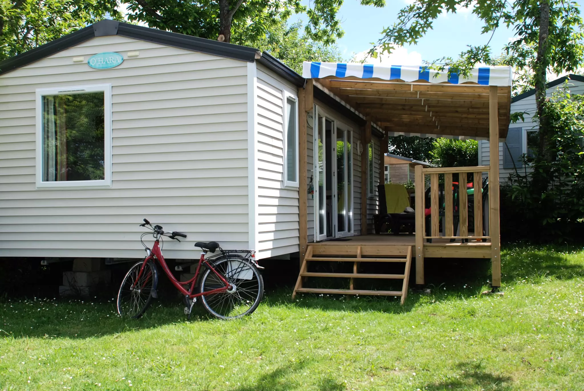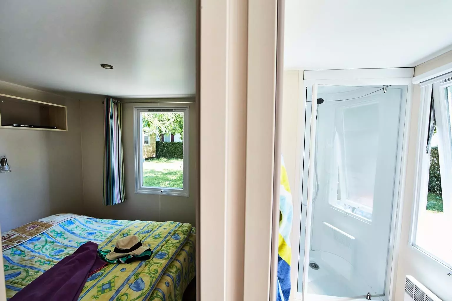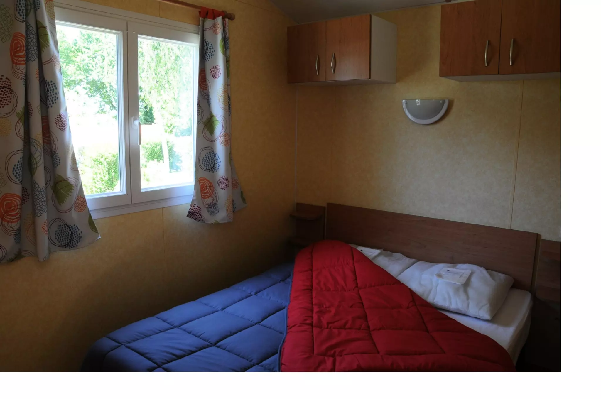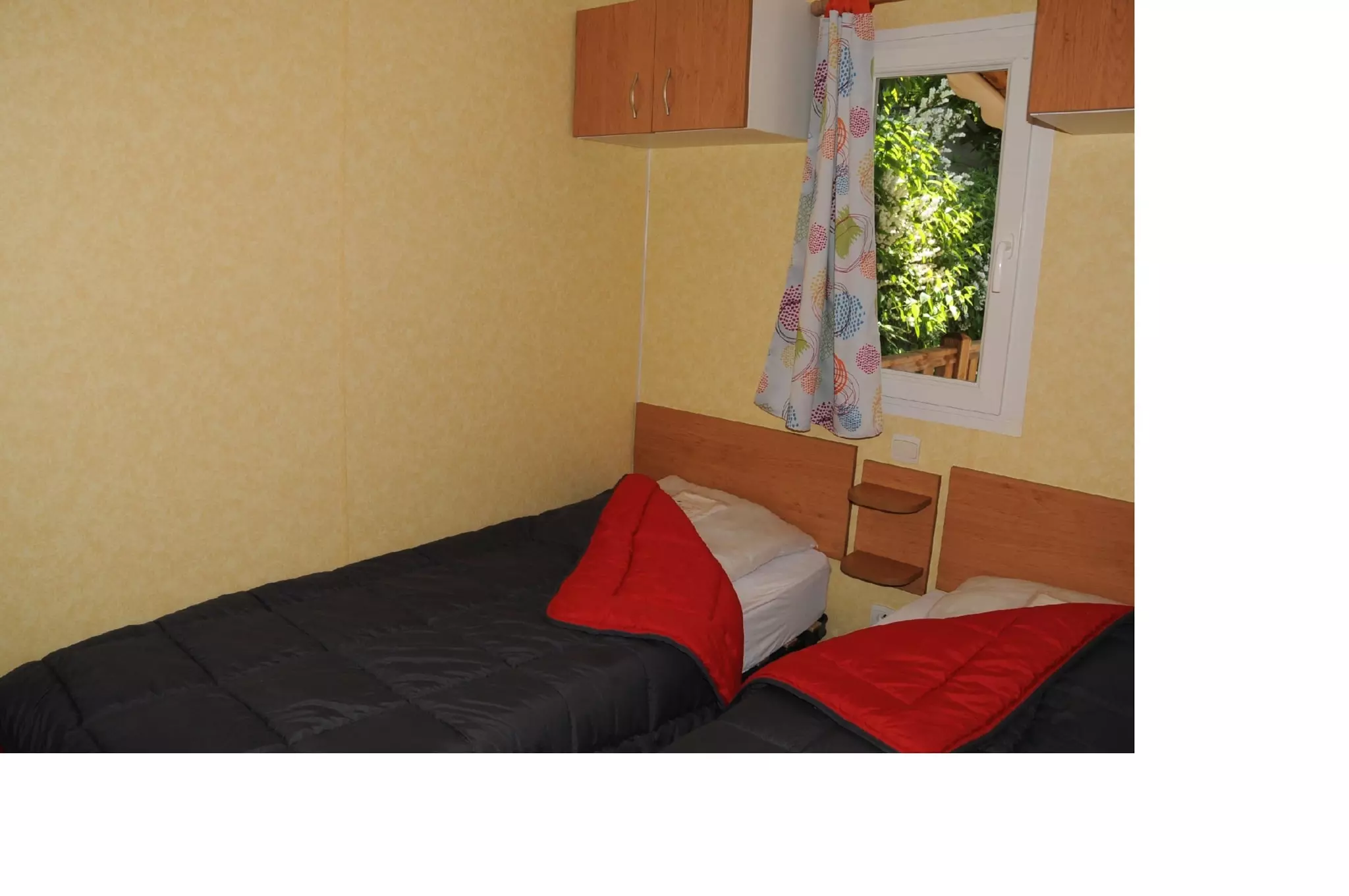 Mobil-Home 2 chambres pour 4 personnes, 1 chambre avec un grand lit et 1 chambre avec 2 petits lits (possibilité de les rapprocher), couettes et oreillers fournis, kitchenette équipée avec cafetière, micro-ondes, plaque 4 feux gaz, réfrigérateur/congélateur, séjour avec banquette, télévision, salle d'eau avec WC séparés, terrasse couverte, salon de jardin et bain de soleil, parking voiture.