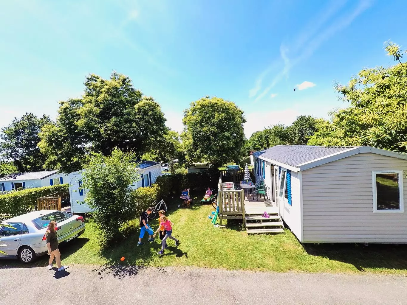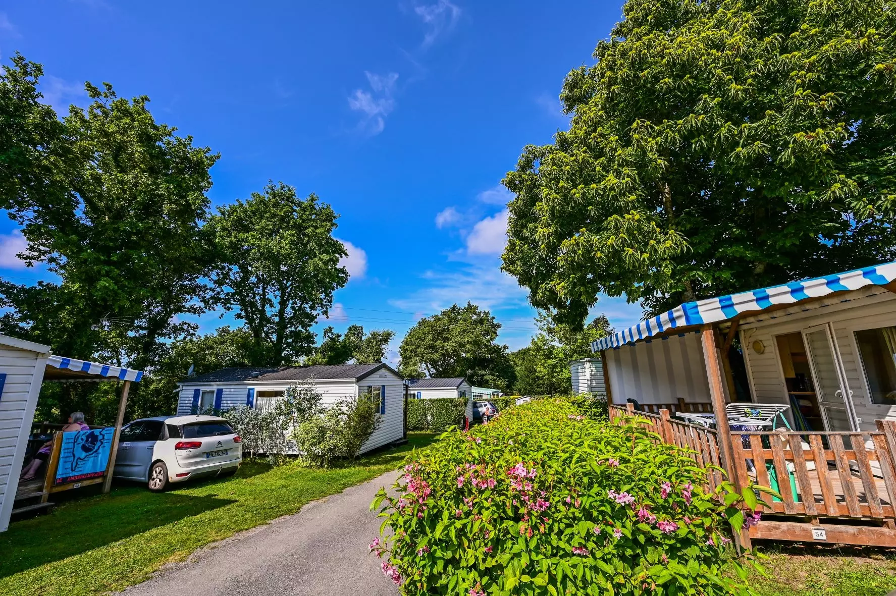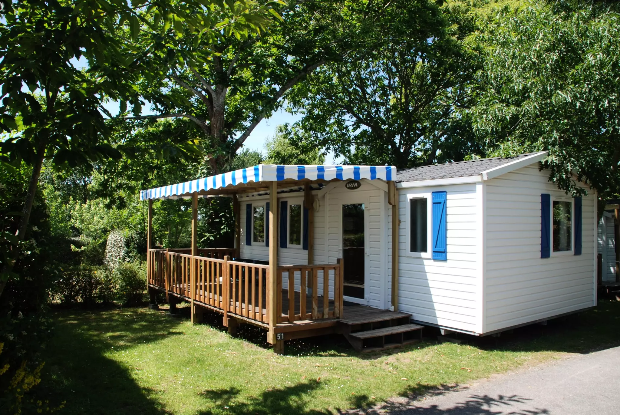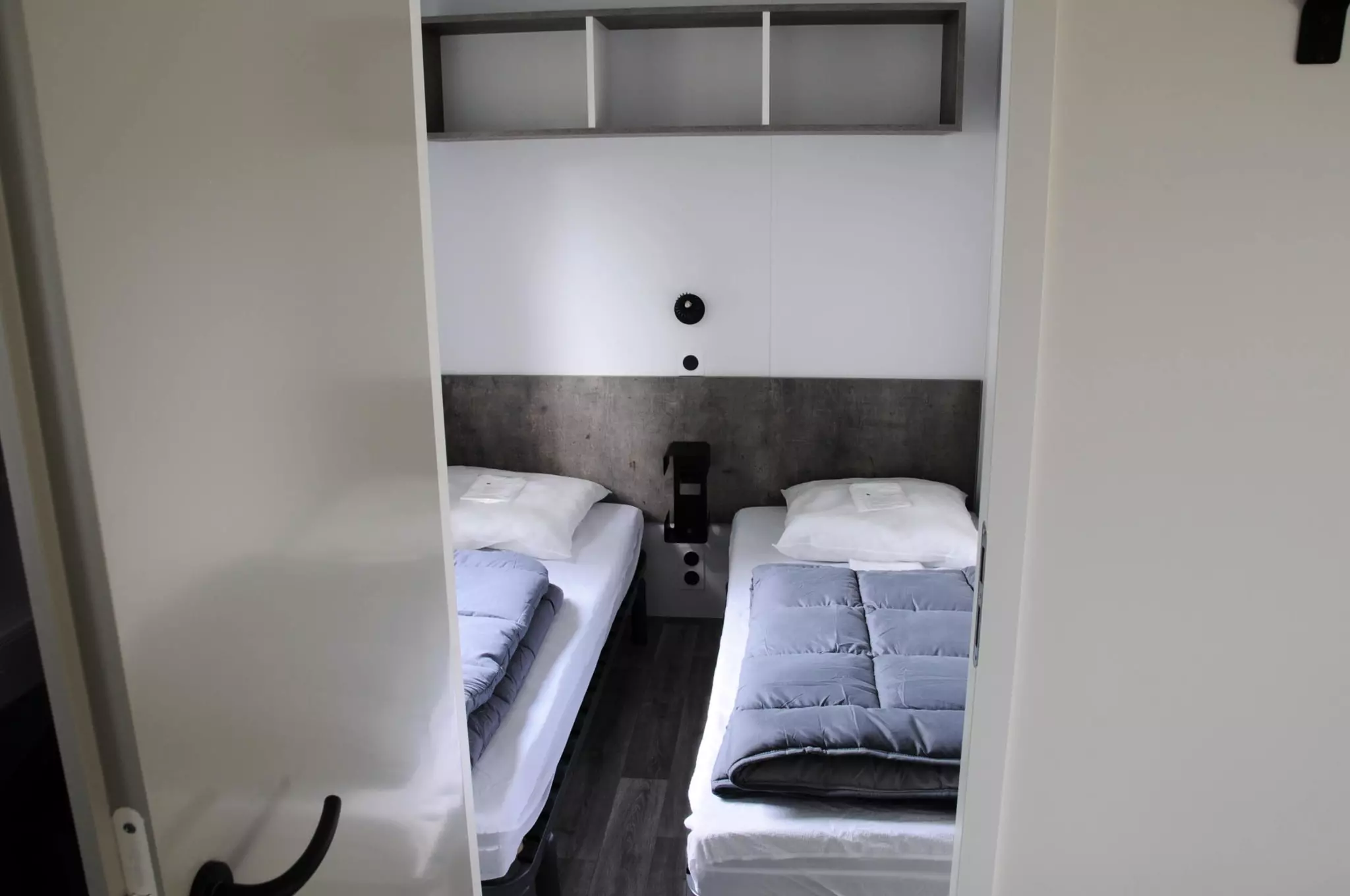 Mobil-Home 2 chambres pour 4 personnes, 1 chambre avec un grand lit et 1 chambre avec 2 petits lits (possibilité de les rapprocher), couettes et oreillers fournis, kitchenette équipée avec cafetière, micro-ondes, plaque 4 feux gaz, réfrigérateur/congélateur, séjour avec banquette, télévision, salle d'eau avec WC séparés, terrasse couverte, salon de jardin et bain de soleil, parking voiture.
