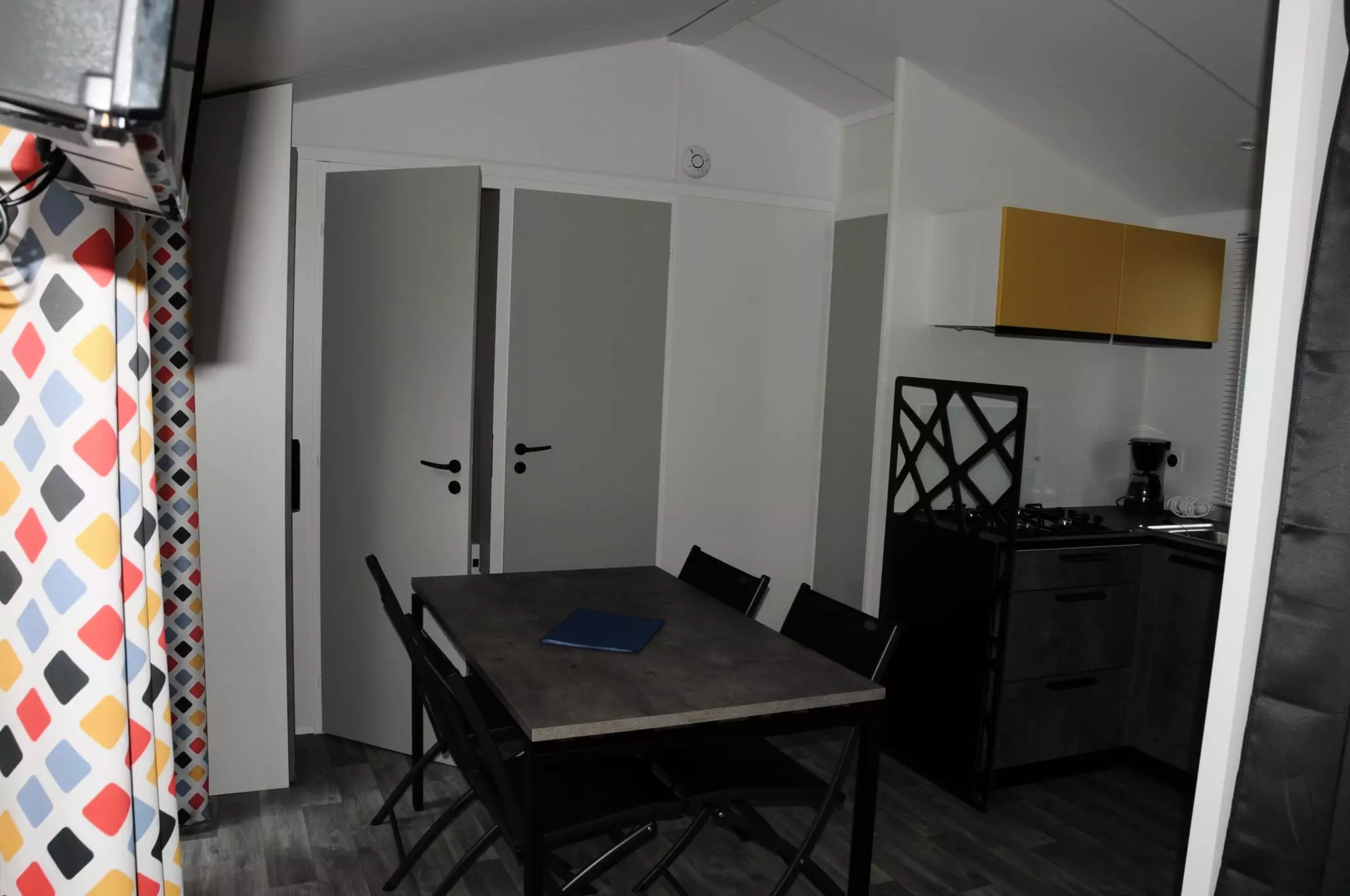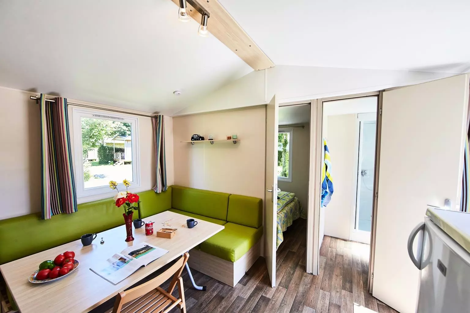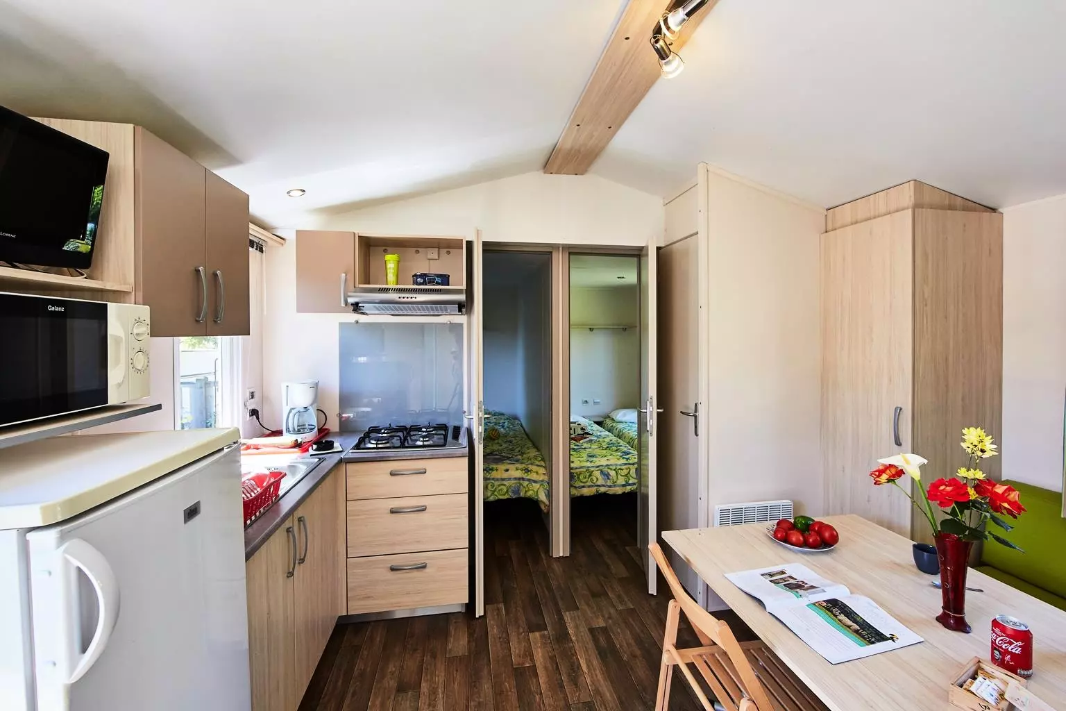 Mobil-Home 1 chambre pour 2 personnes, 1 chambre avec un grand lit, couette et oreillers fournis, kitchenette équipée avec cafetière, micro-ondes, plaque 4 feux gaz, réfrigérateur/congélateur, séjour avec coin salon, télévision, salle d'eau avec WC, terrasse couverte, salon de jardin et bain de soleil, parking voiture.