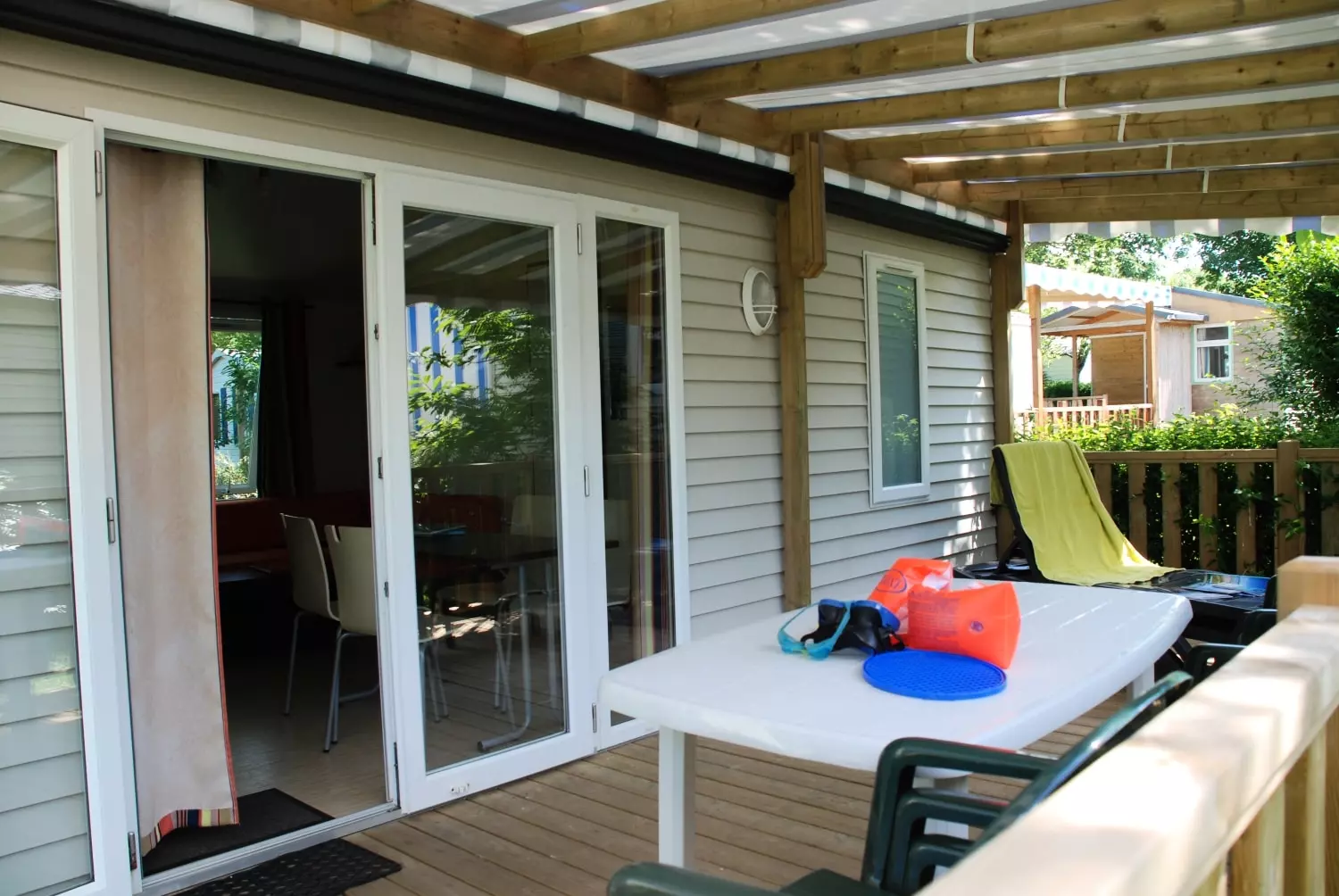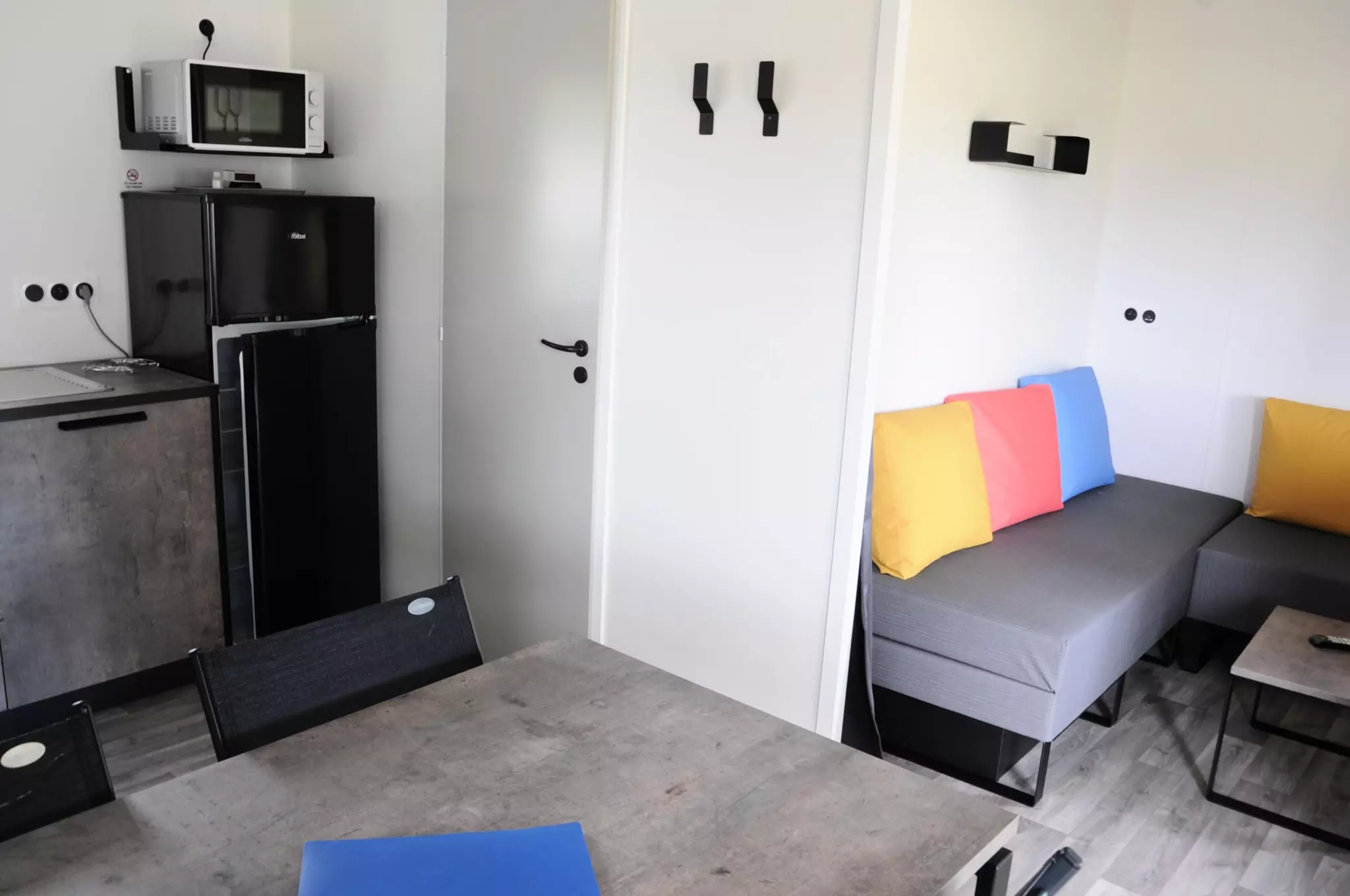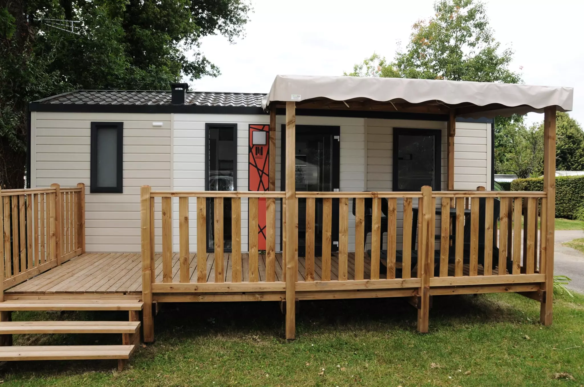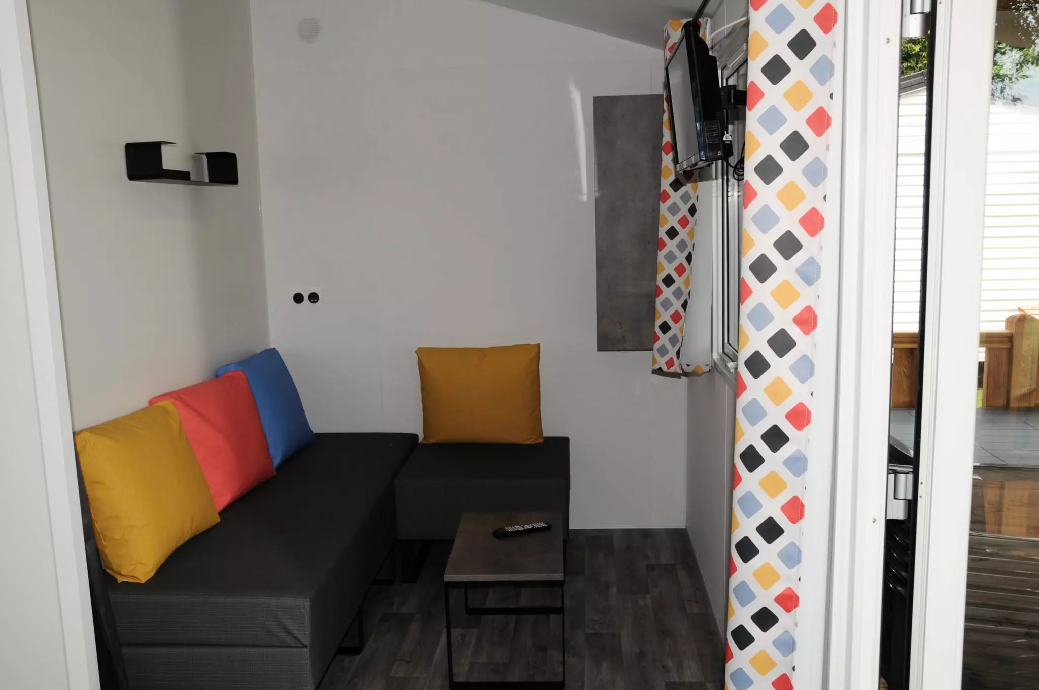 Mobil-Home 1 chambre pour 2 personnes, 1 chambre avec un grand lit, couette et oreillers fournis, kitchenette équipée avec cafetière, micro-ondes, plaque 4 feux gaz, réfrigérateur/congélateur, séjour avec coin salon, télévision, salle d'eau avec WC, terrasse couverte, salon de jardin et bain de soleil, parking voiture.