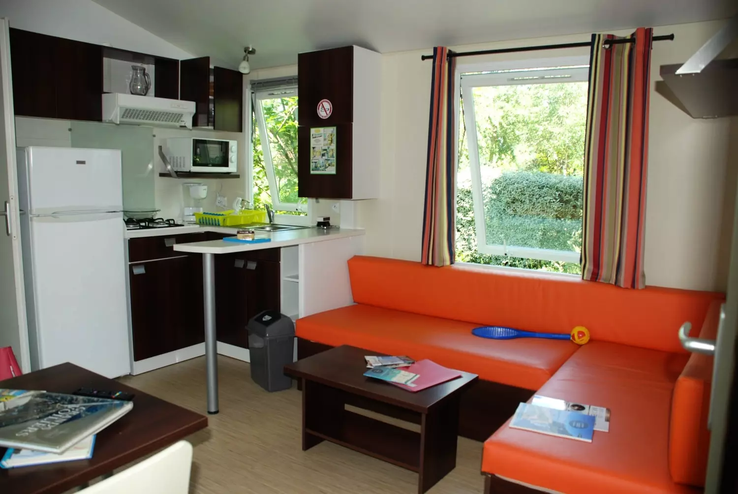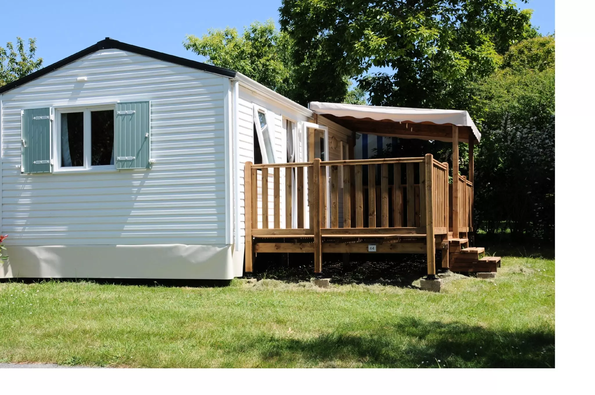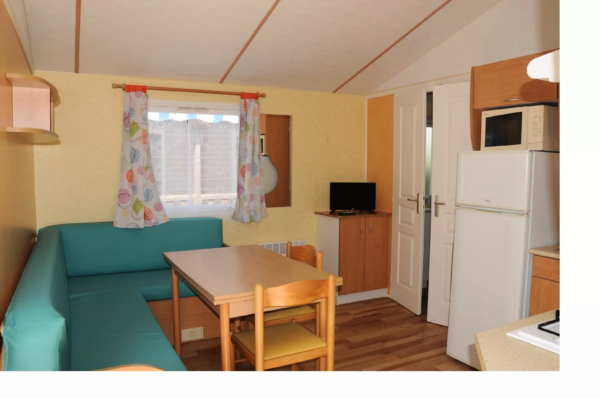 Mobil-home formule économique (+10 ans) 2 chambres pour 4/6 personnes, 1 chambre avec un grand lit, 1 chambre avec 2 petits lits et possibilité de 2 couchages supplémentaires dans le séjour, couettes et oreillers fournis, kitchenette équipée avec cafetière, micro-ondes, plaque 4 feux gaz, réfrigérateur/congélateur, séjour avec banquette, télévision, salle d'eau avec WC séparés, terrasse couverte, salon de jardin et bain de soleil, parking voiture.