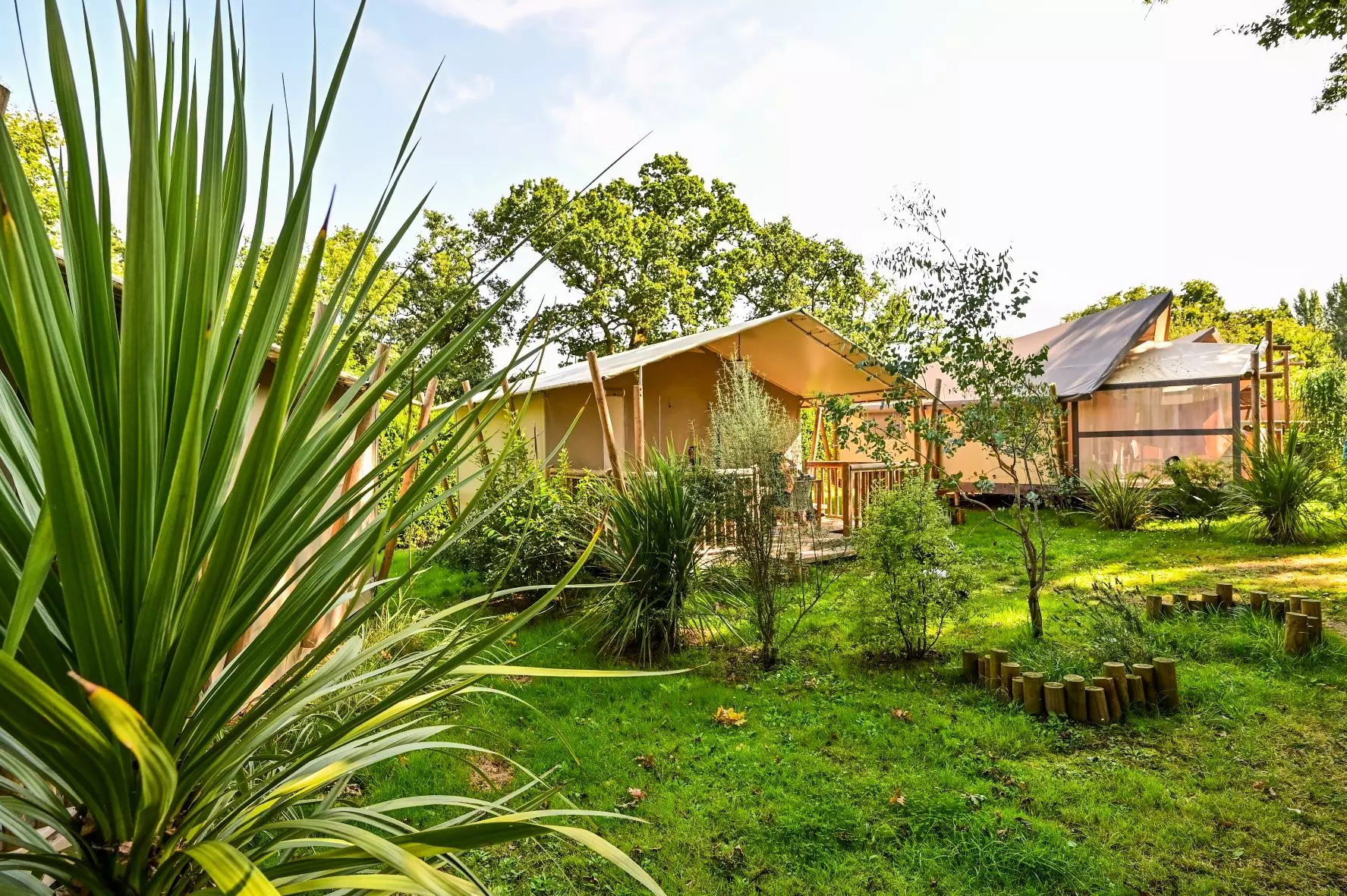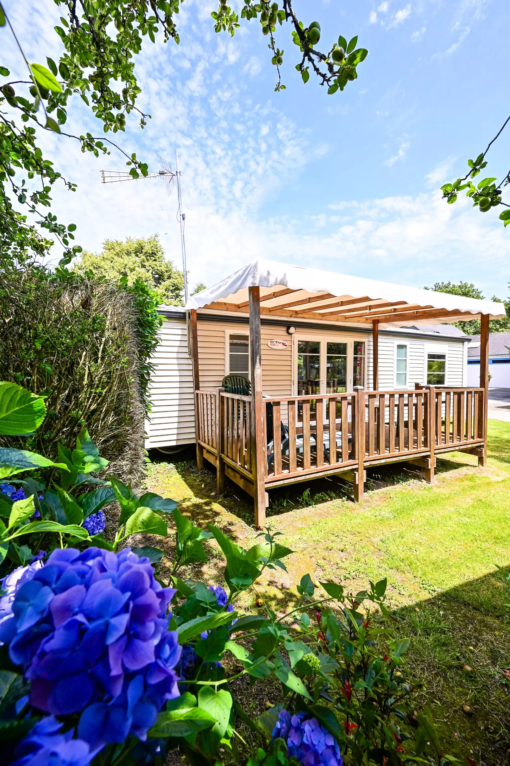 Lodge Belle-Ile sur pilotis de 21 m² sans sanitaires pour 5 personnes, 2 chambres, 1 chambre avec 1 grand lit de 160cm et 1 chambre avec 3 petits lits dont 1 superposé, couettes et oreillers fournis, kitchenette équipée avec plaque 2 feux gaz, réfrigérateur table top, cafetière, bouilloire, terrasse couverte de 11m², bain de soleil et parking privatif. Les animaux ne sont pas autorisés dans les lodges.