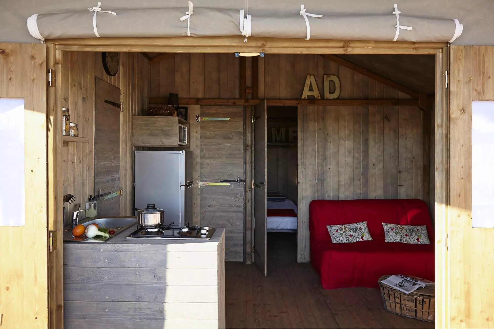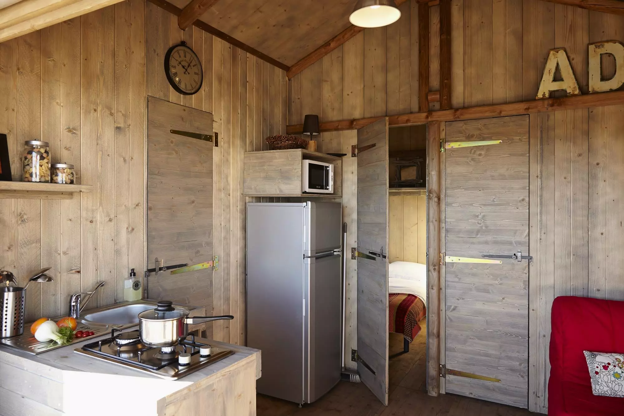 La Cabane comprend un coin cuisine équipé avec réfrigérateur/congélateur, plaques de cuisson 2 feux, micro-ondes, cafetière électrique, ustensiles de cuisine et vaisselle adaptée au nombre de personnes dans le logement. La terrasse dispose d'un salon de jardin.