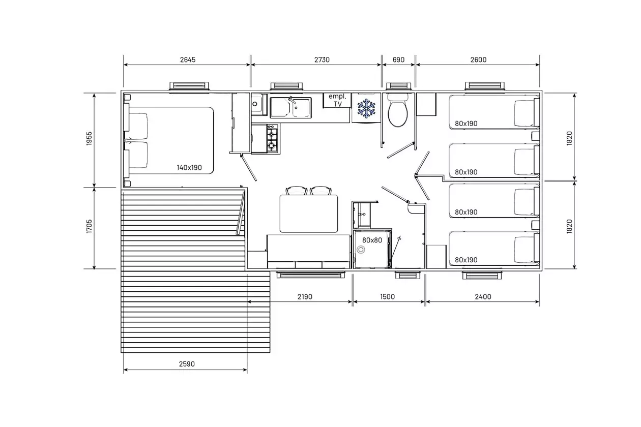 Bénéficiez d'un excellent rapport qualité/prix avec notre mobil-home attrayant de 28m², conçu pour accueillir confortablement jusqu'à 6 personnes. Notre Mobil-Home Confort, à la fois fonctionnel et cosy, représente un choix judicieux pour ceux qui recherchent à la fois économie et confort. Il comprend 3 chambres (une avec un lit double de 160 X 200 cm et deux avec des lits simples de 90 X 190 cm), ainsi qu'une charmante petite terrasse semi-couverte, un espace de vie accueillant et une salle d'eau bien aménagée.