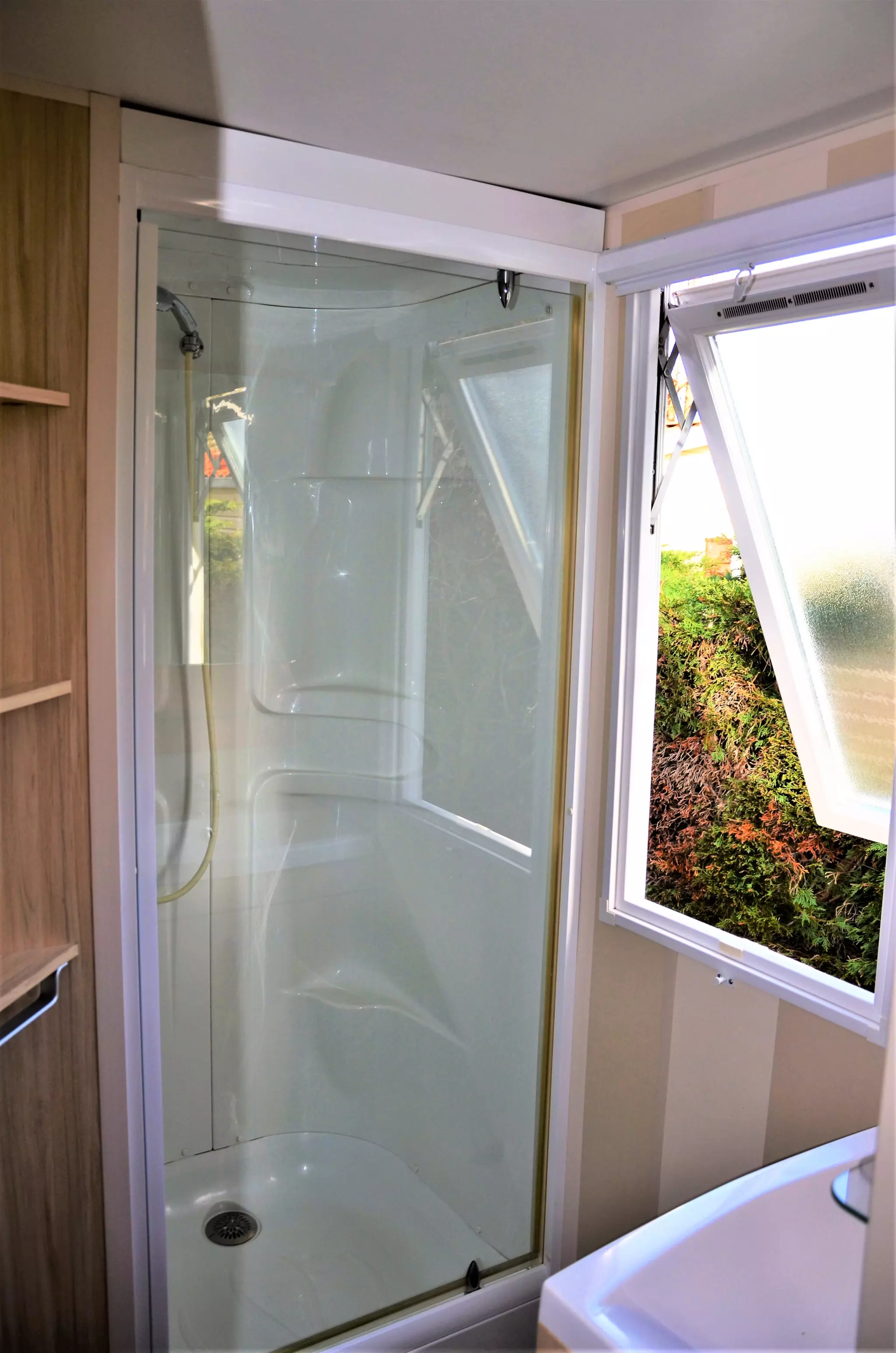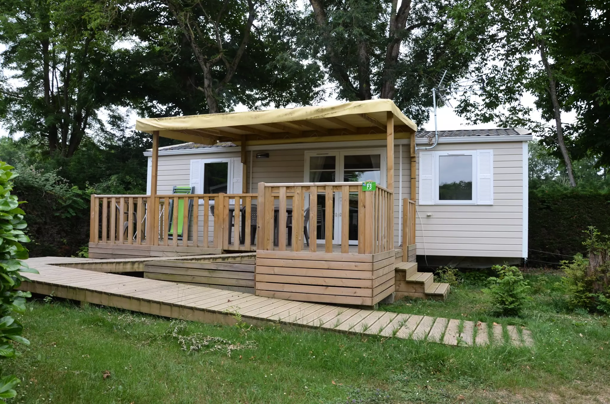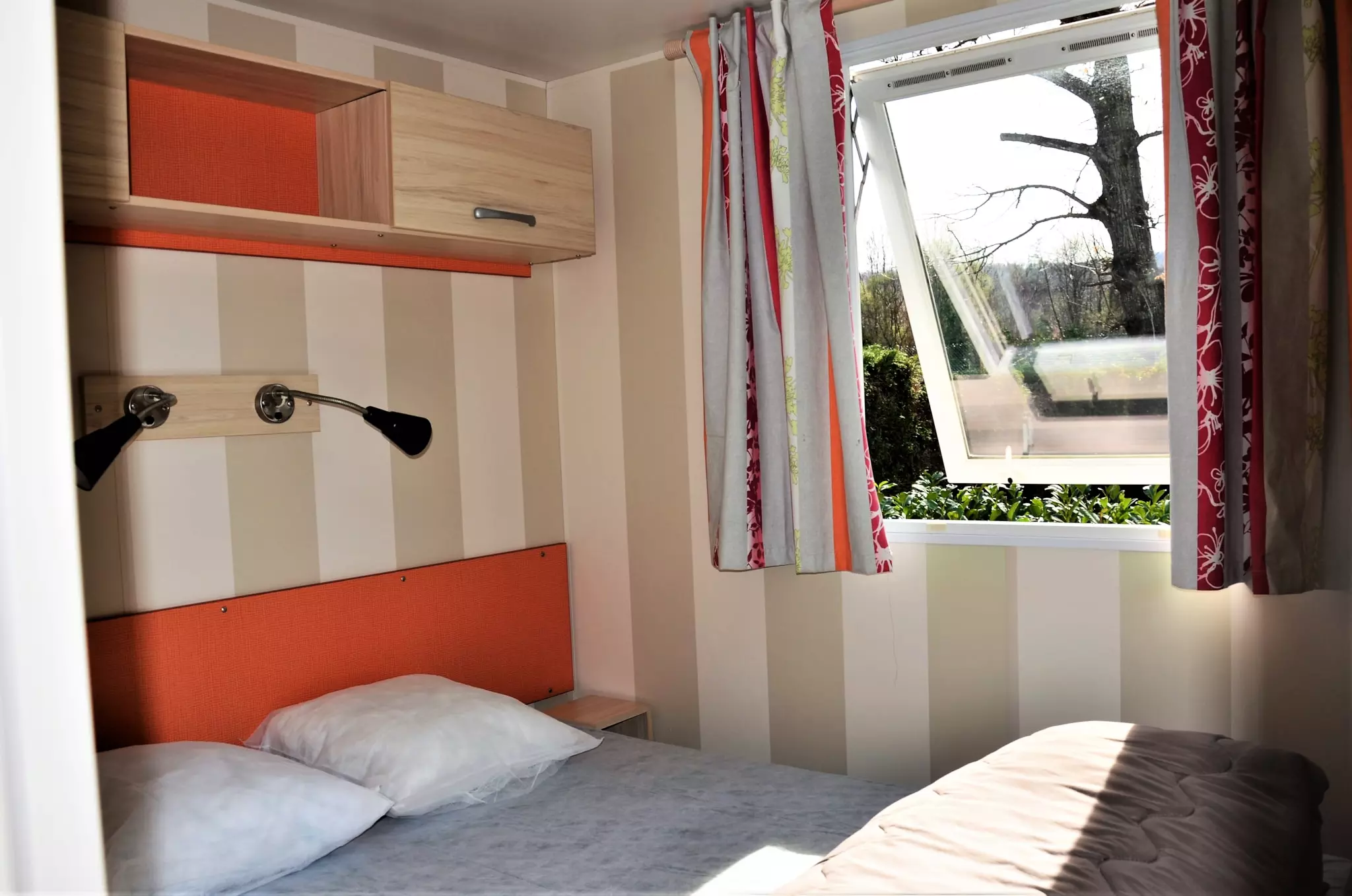Ce mobil-home de deux chambres est spacieux tant au niveau du séjour que de la salle de bain. Il est conçu pour les personnes à mobilité réduite grâce à sa largeur et sa rampe d'accès mais convient également aux familles ayant besoin de plus d'espace. Il est équipé de tout le nécessaire ainsi que d'une télévision.