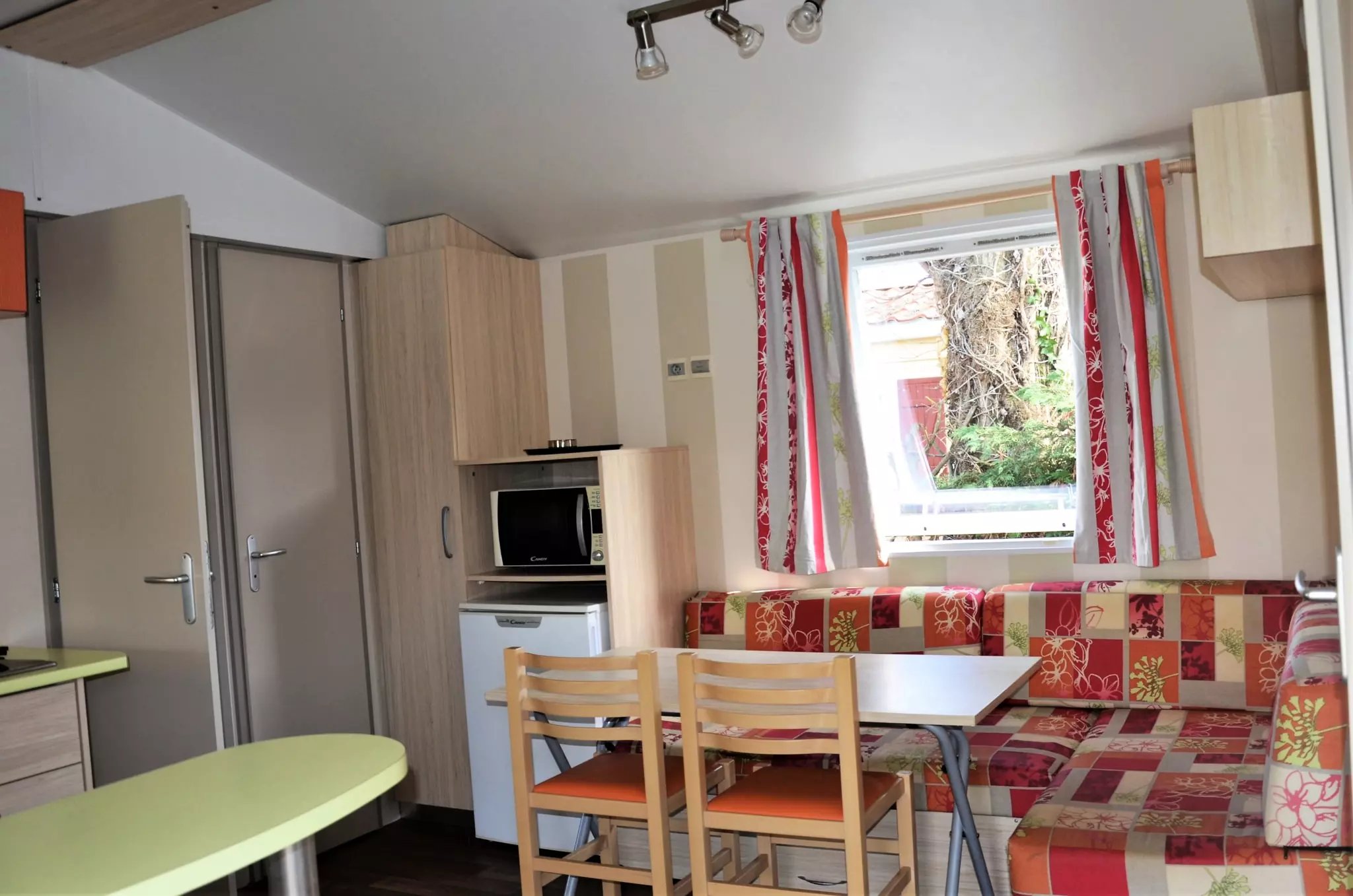 Mobil home équipé d'une cuisine et d'un séjour plus spacieux, WC, salle de bain, téléviseur